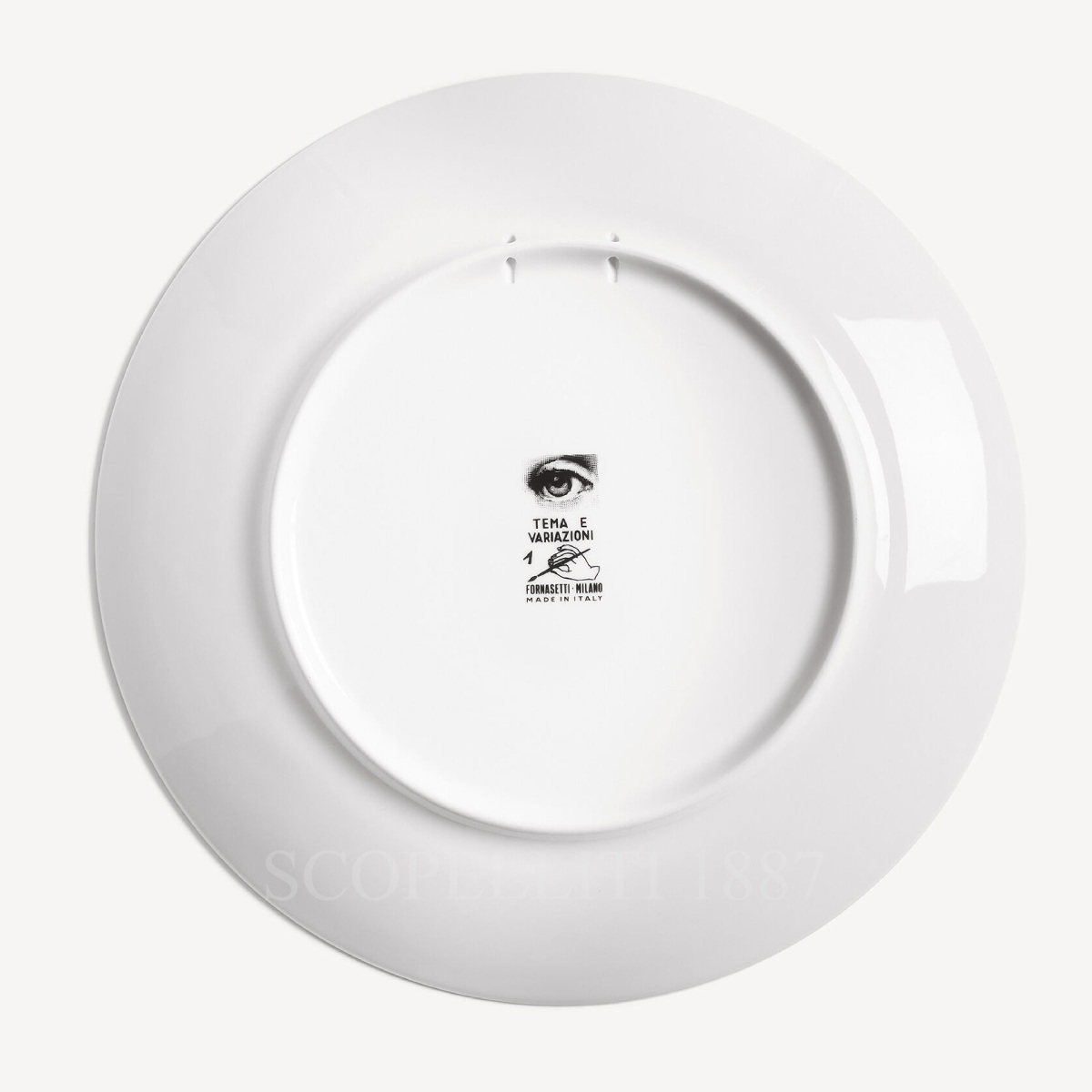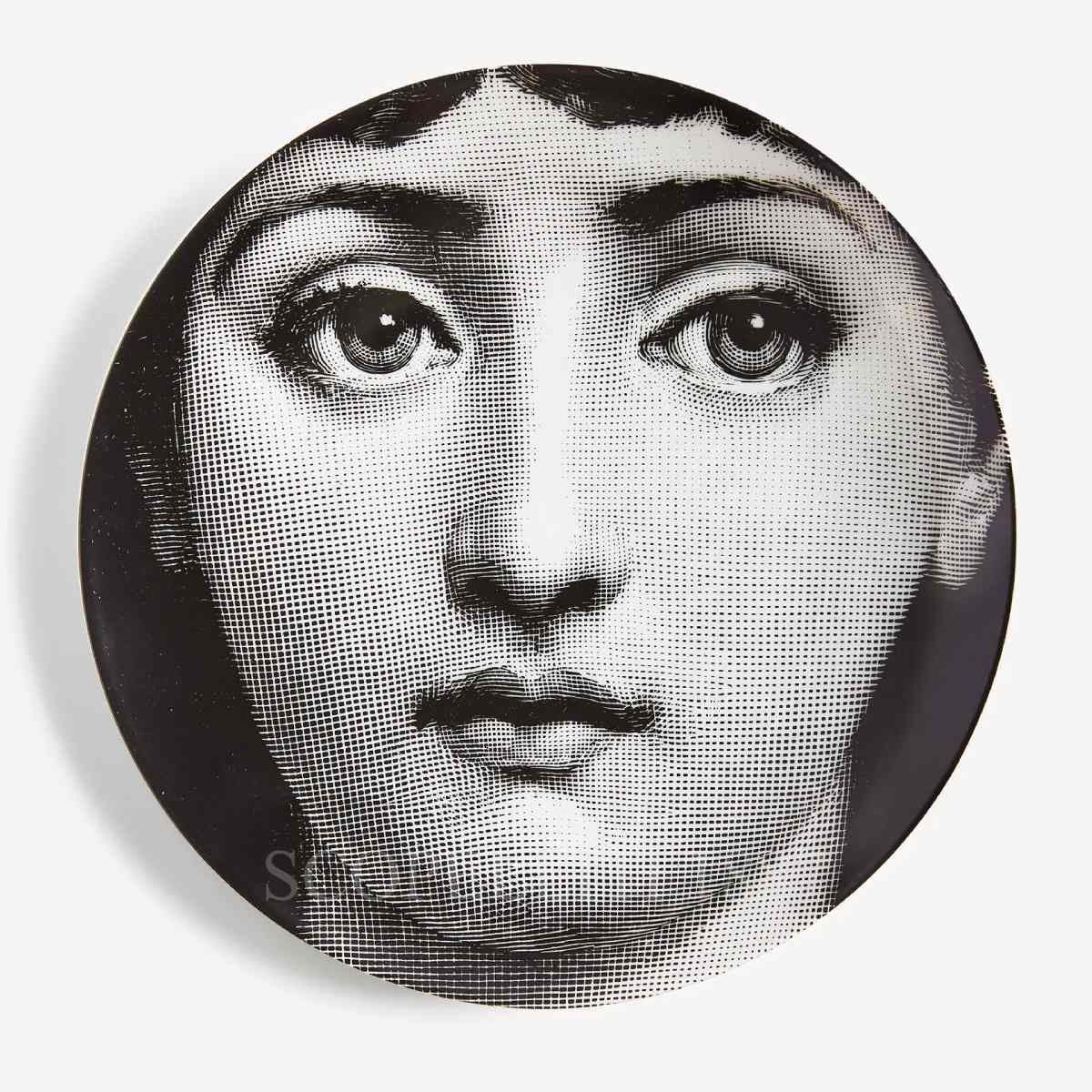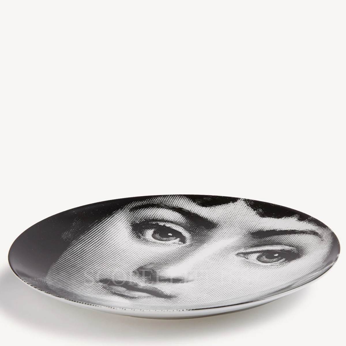 The Fornasetti Plate Tema e Variazioni n.1 presents the iconic face of Lina Cavalieri, the muse of Piero Fornasetti, in the first design of the renowned Tema e Variazioni series. Its hand-decorated black-and-white portrait brings artistic detail and graphic sophistication to any interior. Crafted entirely in Italy, this Fornasetti decorative porcelain plate can be displayed on a wall using the two pre-drilled holes or positioned as a centerpiece on tables, shelves, or console surfaces. Each plate shows subtle variations in finish and line work, reflecting the individual character of every hand-decorated piece.