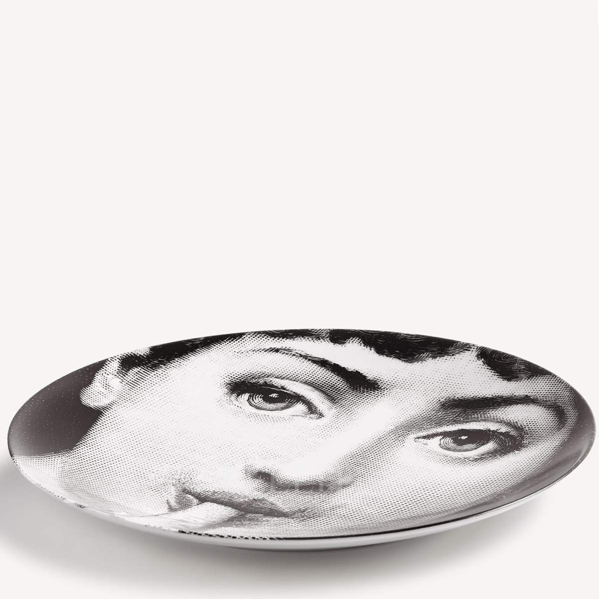 The Fornasetti Plate Tema e Variazioni n.178 presents Lina Cavalieri in a subtle, enigmatic pose, her finger resting near her lips and her gaze gently tilted. The black-and-white porcelain design emphasizes delicate facial lines and expressive detail, creating a visual narrative that transforms a classic portrait into a contemporary decorative statement. The round format allows it to be displayed alone, grouped with other plates from the series, or placed on a table as a sculptural accent.