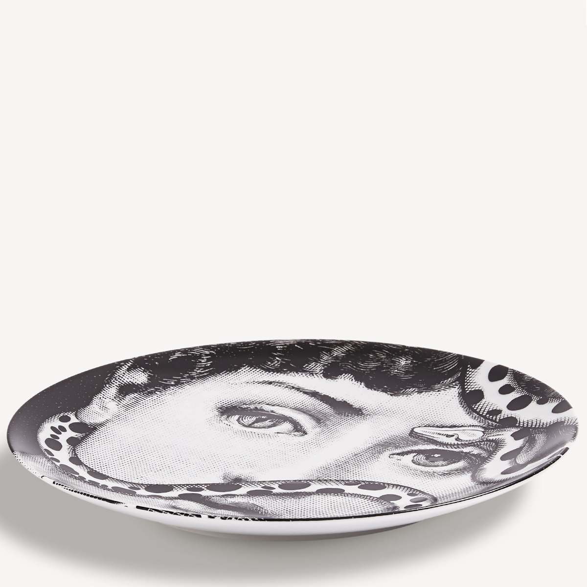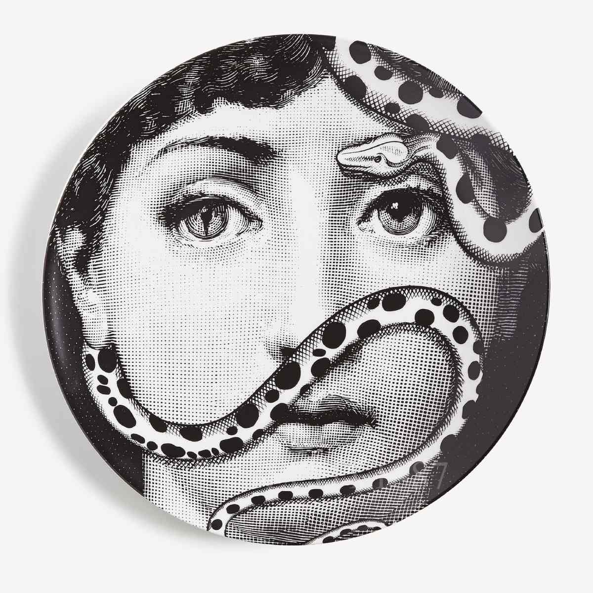 The Fornasetti Plate Tema e Variazioni n.383 reinterprets Lina Cavalieri’s iconic face with a coiling serpent woven through her hair and across her brow, creating a composition that balances serenity and tension. The interplay between the delicate facial features and the sinuous snake introduces a symbolic and slightly surreal element, characteristic of the Fornasetti decorative plate series. The contrast between monochrome illustration and graphic motif emphasizes visual depth, enhancing its presence as a luxury Italian decorative object.
