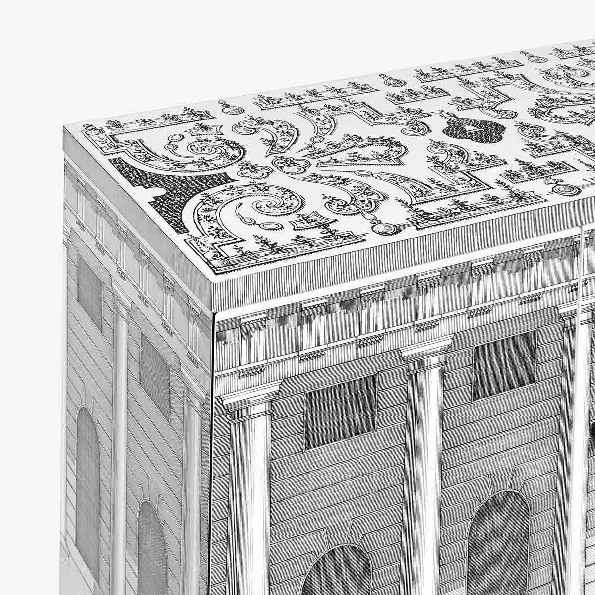 The Fornasetti Raised Small Sideboard Architettura features a detailed black-and-white architectural façade inspired by Renaissance perspective and illusionistic drawing. The hand-applied decoration reflects the graphic vision of Piero Fornasetti, giving this cabinet a strong visual identity within Italian designer furniture.