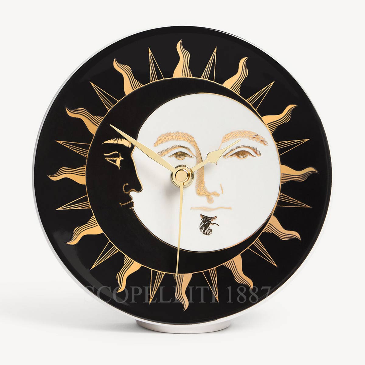 The Fornasetti Table Clock Giorno e Notte celebrates duality through the interplay of sun and moon, capturing day and night in a single poetic composition. This Fornasetti Giorno e Notte clock, part of the iconic Tema e Variazioni series, exemplifies luxury Italian designer table clocks and the Maison’s signature blend of symbolism and visual narrative. The black, white, and gold palette enhances contrast and depth, while the gold-colored clock hands add a refined accent, positioning this piece within premium Italian home décor and high-end decorative desk clocks. Ideal for desktops, nightstands, bookshelves, this luxury Italian table clock really functional, full of elegance with artistic expression.