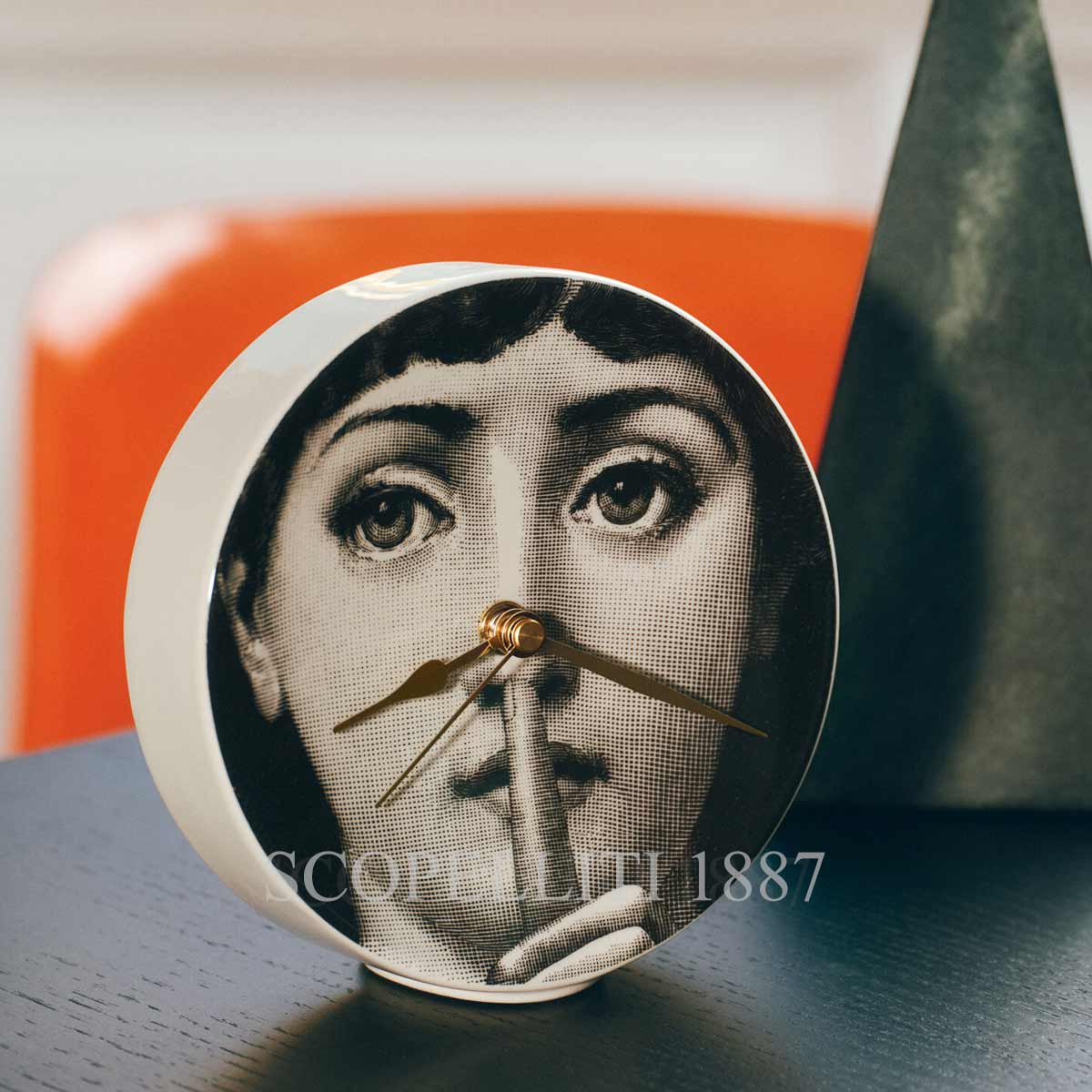 The Fornasetti Table Clock Silenzio introduces one of the Maison’s most recognizable images into a refined decorative timepiece. Featuring Lina Cavalieri with a finger pressed to her lips, this Fornasetti Silenzio clock belongs to the celebrated Tema e Variazioni series and represents a signature example of luxury Italian designer table clocks.