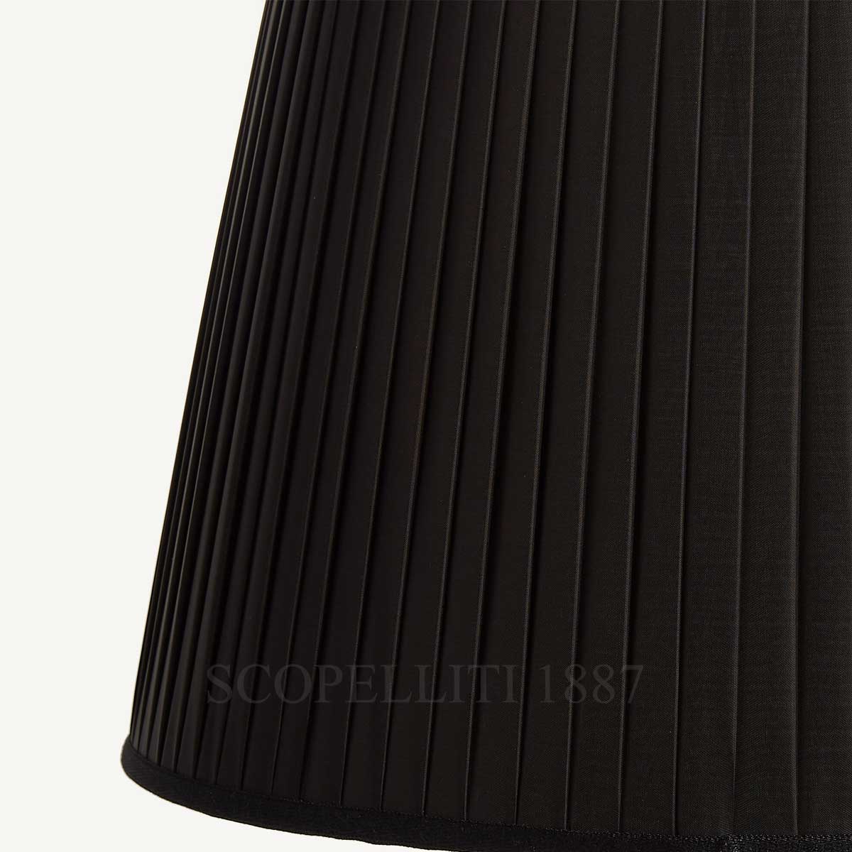 Silkscreened by hand on painted metal, the base reflects the distinctive processes associated with authentic Fornasetti lamps. Natural variations highlight the individuality of each piece, reinforcing its position within the world of collectible Italian design objects. The pleated conical lampshade in refined cupro fabric introduces textural contrast, balancing graphic precision with visual softness, a characteristic feature of high-end interior lighting.