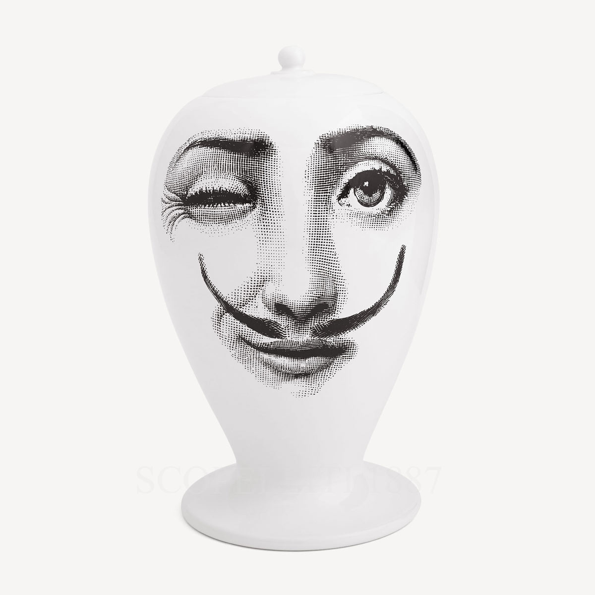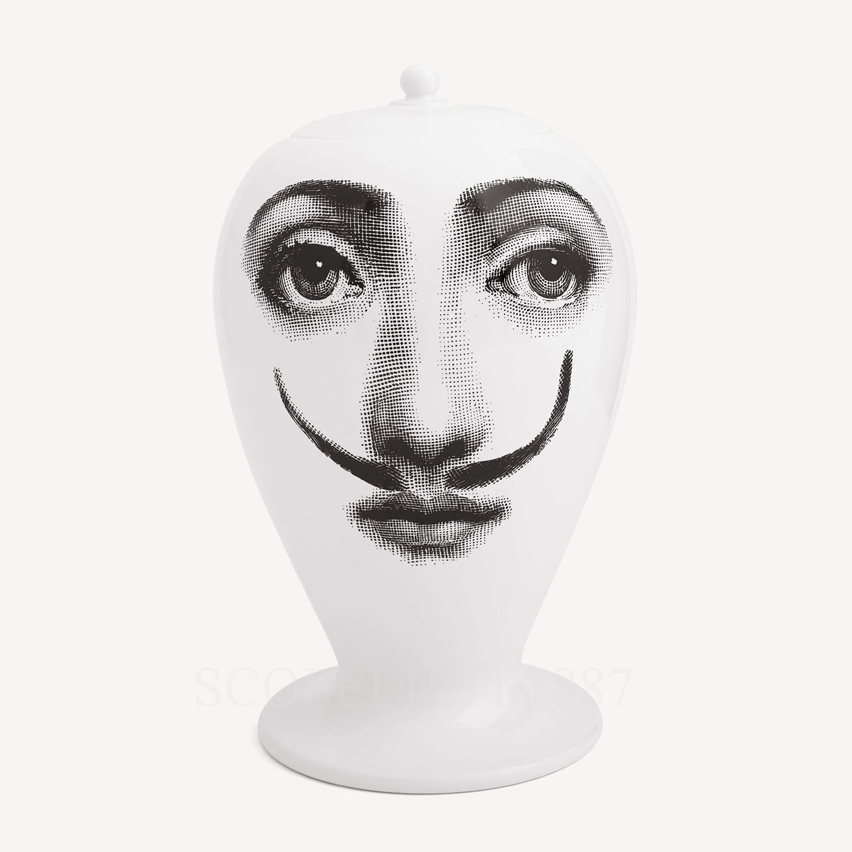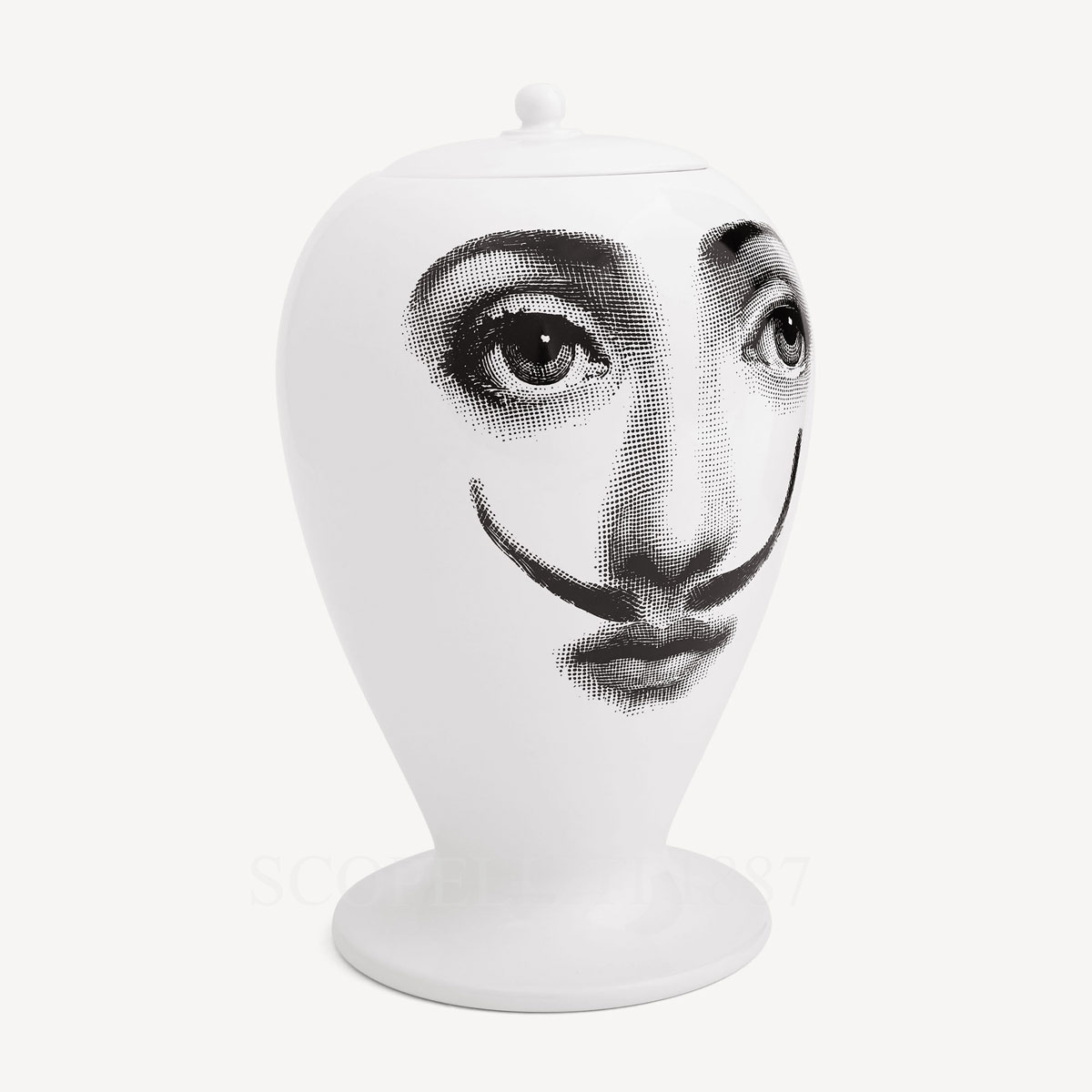 The Fornasetti Vase La Femme Aux Moustaches presents an ironic reinterpretation of Lina Cavalieri’s celebrated portrait, where the classical face appears with an unexpected moustache. This playful intervention belongs to the renowned Tema e Variazioni visual universe imagined by Piero Fornasetti, where the image of Lina Cavalieri evolves through endless artistic variations.