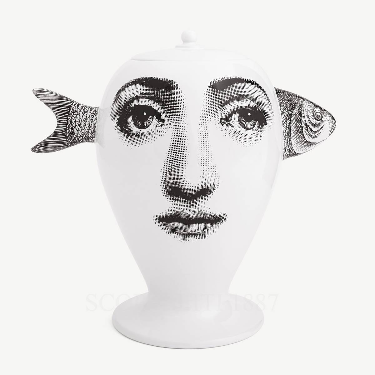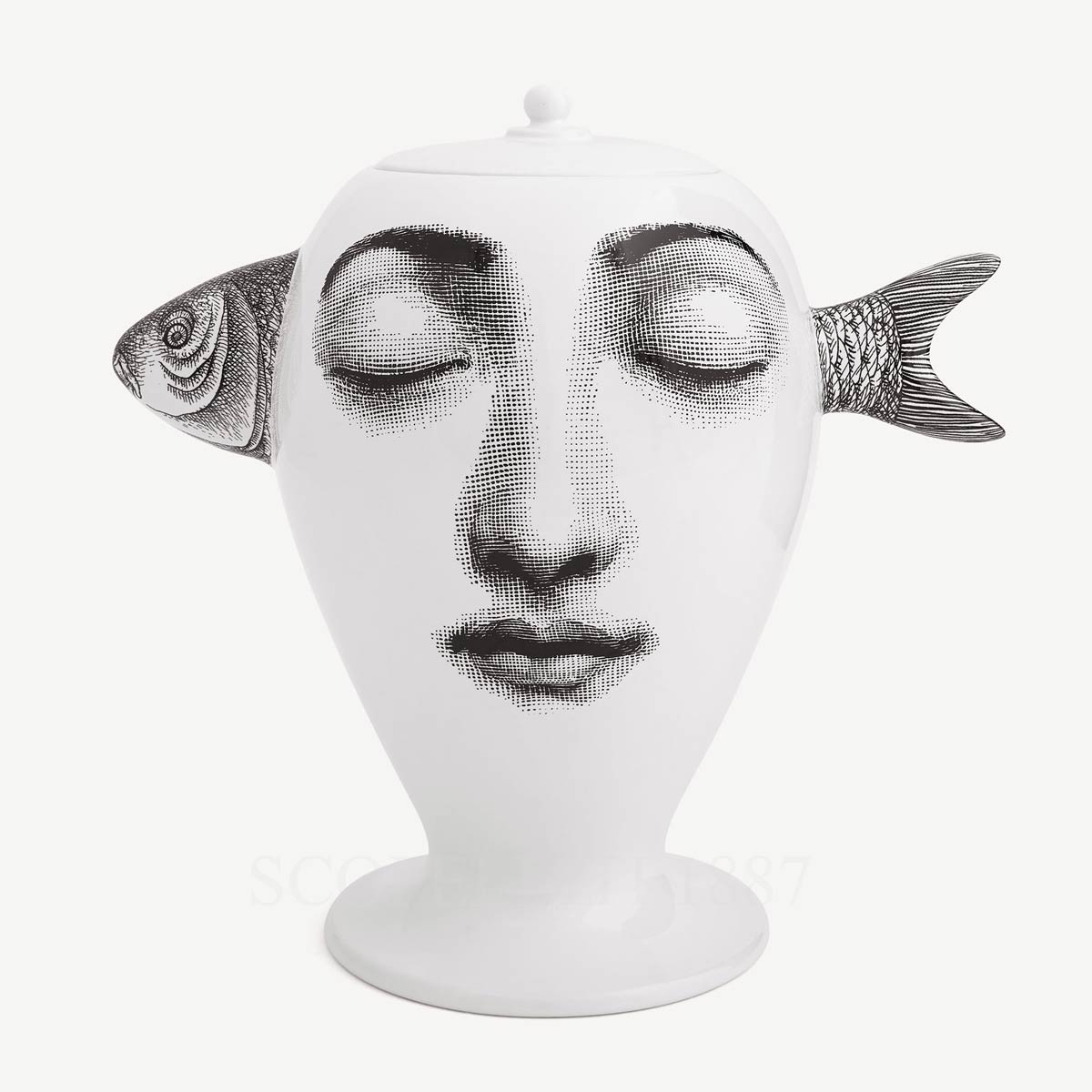 The Fornasetti Vase Pesce introduces an unexpected variation of the portrait of Lina Cavalieri, the celebrated muse repeatedly interpreted by Piero Fornasetti. In this design, the classical face appears alongside a fish motif, an imaginative visual element that belongs to the broader Tema e Variazioni universe and reflects the atelier’s fascination with surreal transformations of a single image.