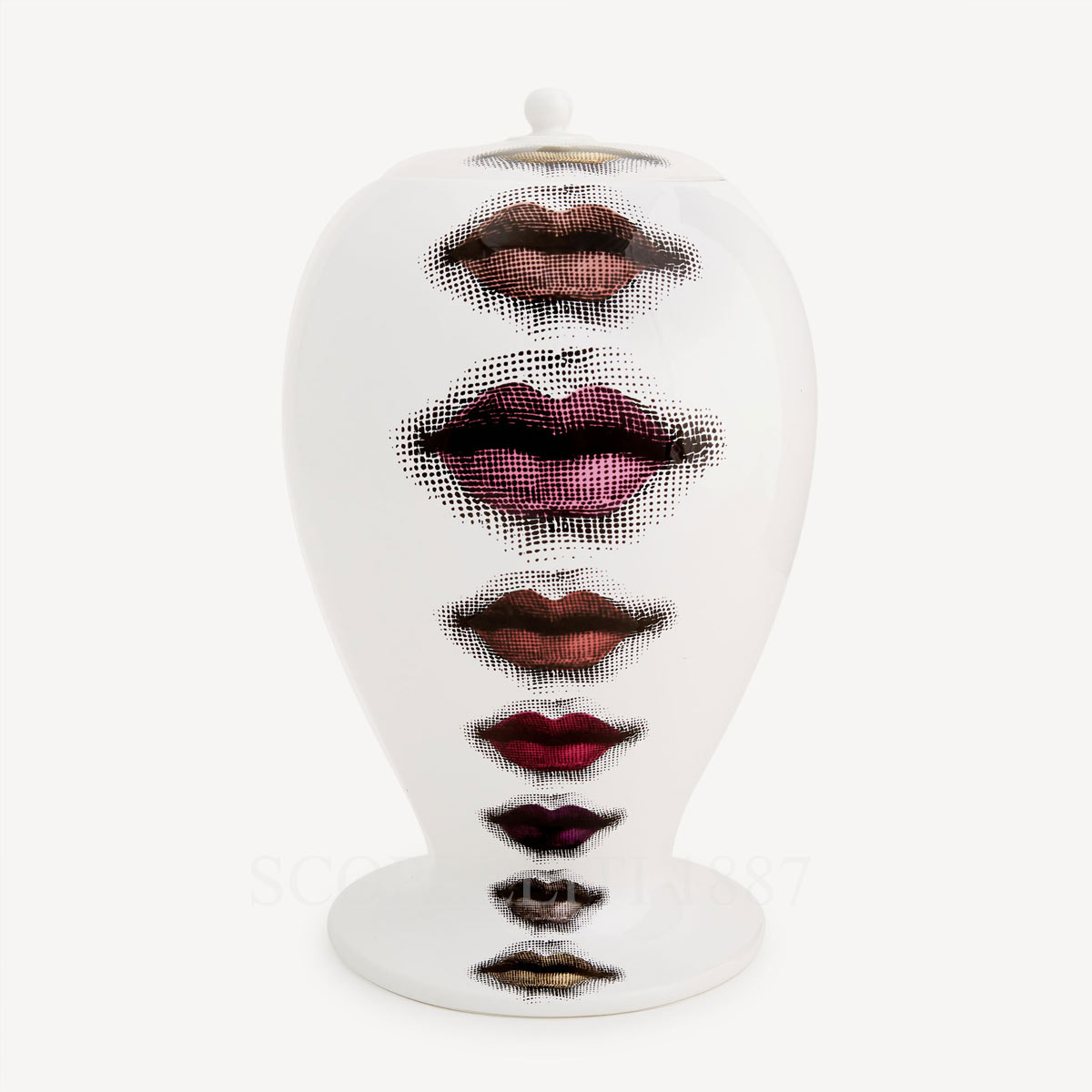 The Fornasetti Vase Rossetti presents the unmistakable portrait of Lina Cavalieri, the enduring muse behind the celebrated Tema e Variazioni imagery conceived by Piero Fornasetti. The composition focuses on her enigmatic expression, rendered in a restrained graphic style that highlights the visual language associated with the Milanese atelier.