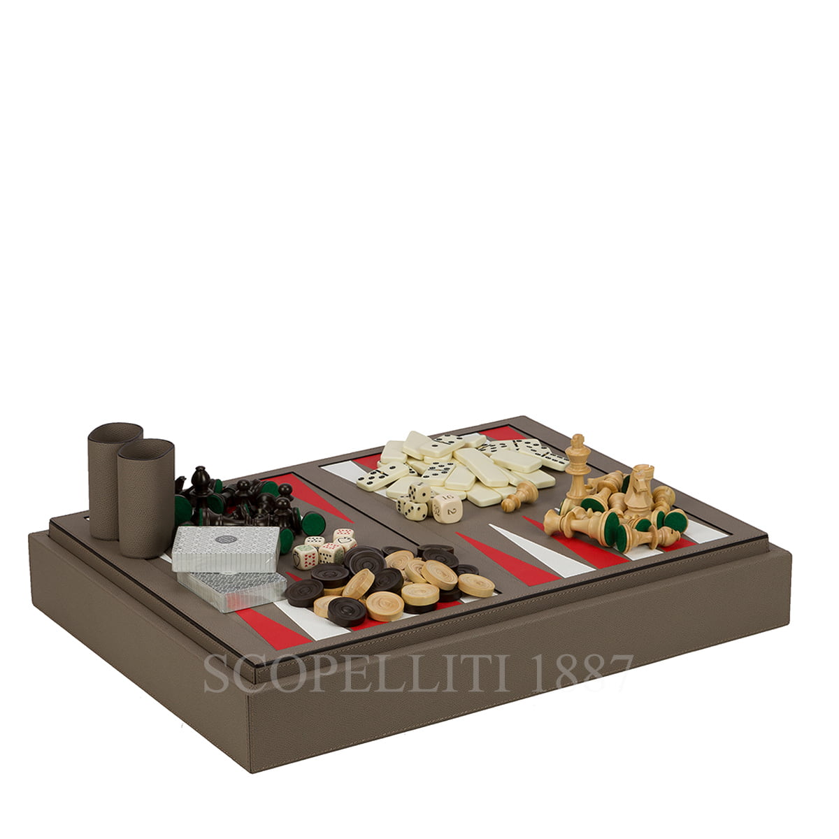 Game Compendium Giobagnara in Leather is an extraordinary combination of covered wood structure and leather to enjoy your playtime with friends. Gift Box included. Made in Italy. Size: 55,5 x 42 cm, Height: 8,5 cm Order as pictured, or customize by picking a color of your choice here for the corresponding leather material. Please specify the color code in the Order Notes section upon checkout. The Leather Game Compendium by Giobagnara is a unique item of highest quality and style. This exclusive game box includes 4 games in one: Chess, Checkers, Backgammon and Dominos enclosed in one elegant quality item. It includes boxwood chess, boxwood draughts, bakelite dominos, 2 decks of high quality playing cards, 2 dice cups, 5 standard dices and 5 poker dices. This Game Compendium  is a perfect gift for the person that has everything.