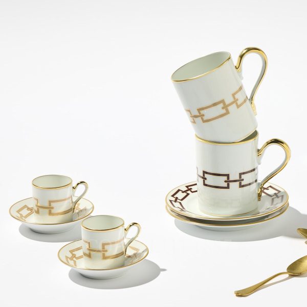 The Ginori 1735 Catene Cachemire Coffee Cup and Saucer set is a refined pairing that brings a touch of Italian artistry to your coffee experience. Featuring the elegant Cachemire pattern with soft beige tones and gold accents, this set is crafted to offer a perfect balance of form and function. Ideal for your morning espresso or a delicate coffee break, the coffee cup and saucer set blends classic design with contemporary flair, making it a timeless addition to any table setting.