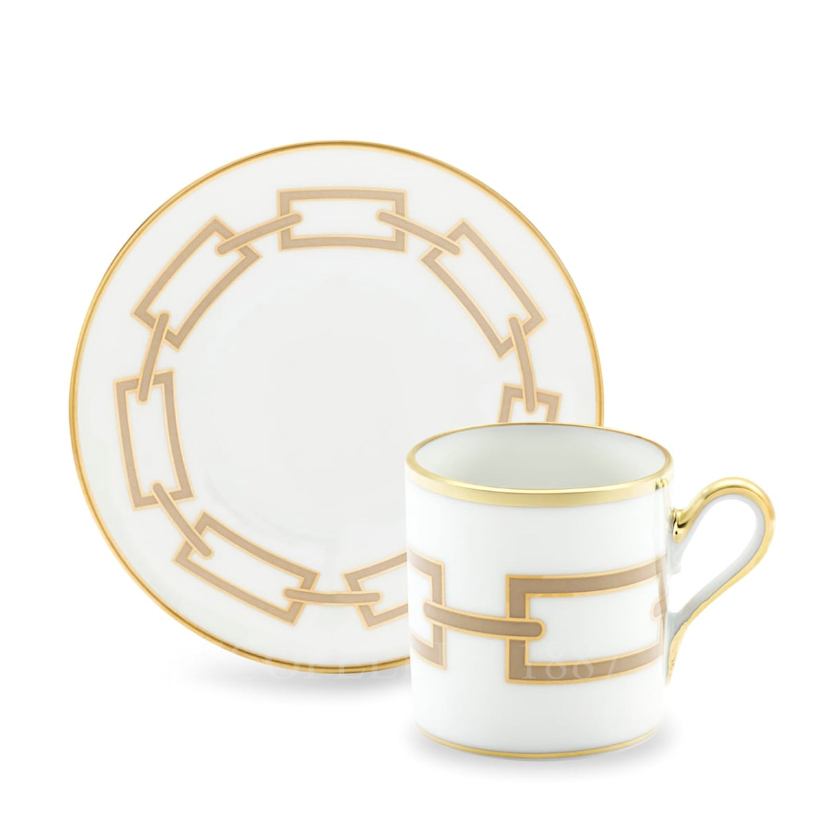 The Ginori 1735 Catene Cachemire Coffee Cup and Saucer set is a refined pairing that brings a touch of Italian artistry to your coffee experience. Featuring the elegant Cachemire pattern with soft beige tones and gold accents, this set is crafted to offer a perfect balance of form and function. Ideal for your morning espresso or a delicate coffee break, the coffee cup and saucer set blends classic design with contemporary flair, making it a timeless addition to any table setting.