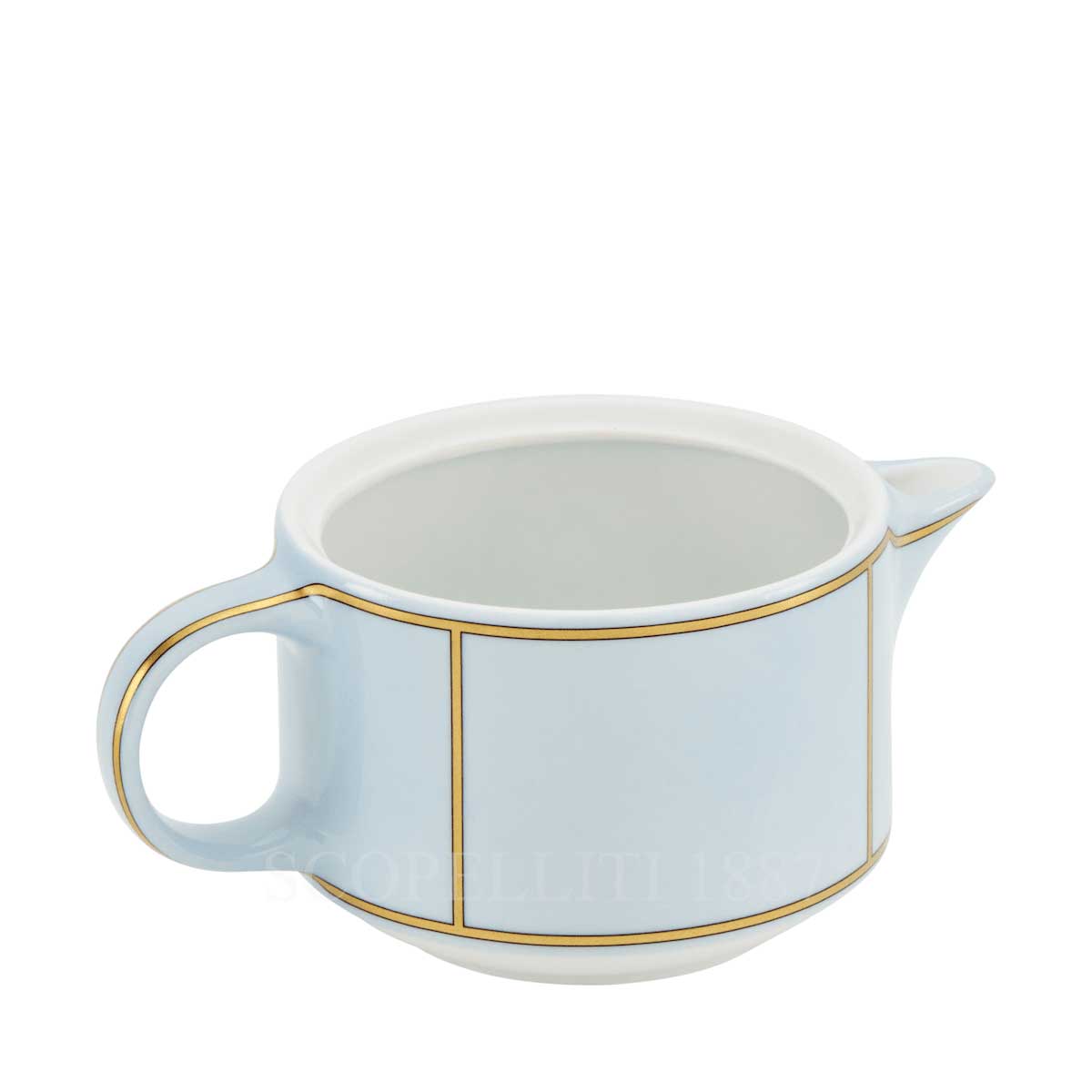 The new Diva collection features a porcelain teapot adorned with light blue and gold designs. This elegant decoration is a signature of Ginori 1735 and pairs perfectly with other items in the set, like the sugar bowl, milk pitcher, cups, and plates. These pieces are available in four different colors that can be mixed and matched. The Diva collection honors Ginori 1735’s legacy, bringing a modern twist to the classic Colonna shape created by Giovanni Gariboldi in the 1950s. These timeless Italian designs are stackable and space-efficient, a concept that won Gariboldi the prestigious Compasso d’Oro award for design.