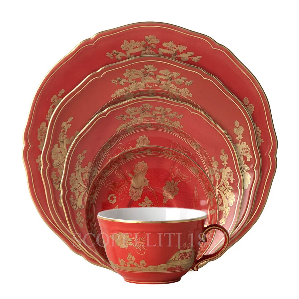 Ginori 1735 Dinner Set from Oriente Italiano Rubrum collection is a colorful 5 piece place setting that embodies in its vast assortment the artisan passion that has been a hallmark of the brand for nearly three centuries. A passion by which it has been driven to great heights, daring in the study of colors to be applied to porcelain pieces and in quest for designs that have marked the history of Made in Italy style.