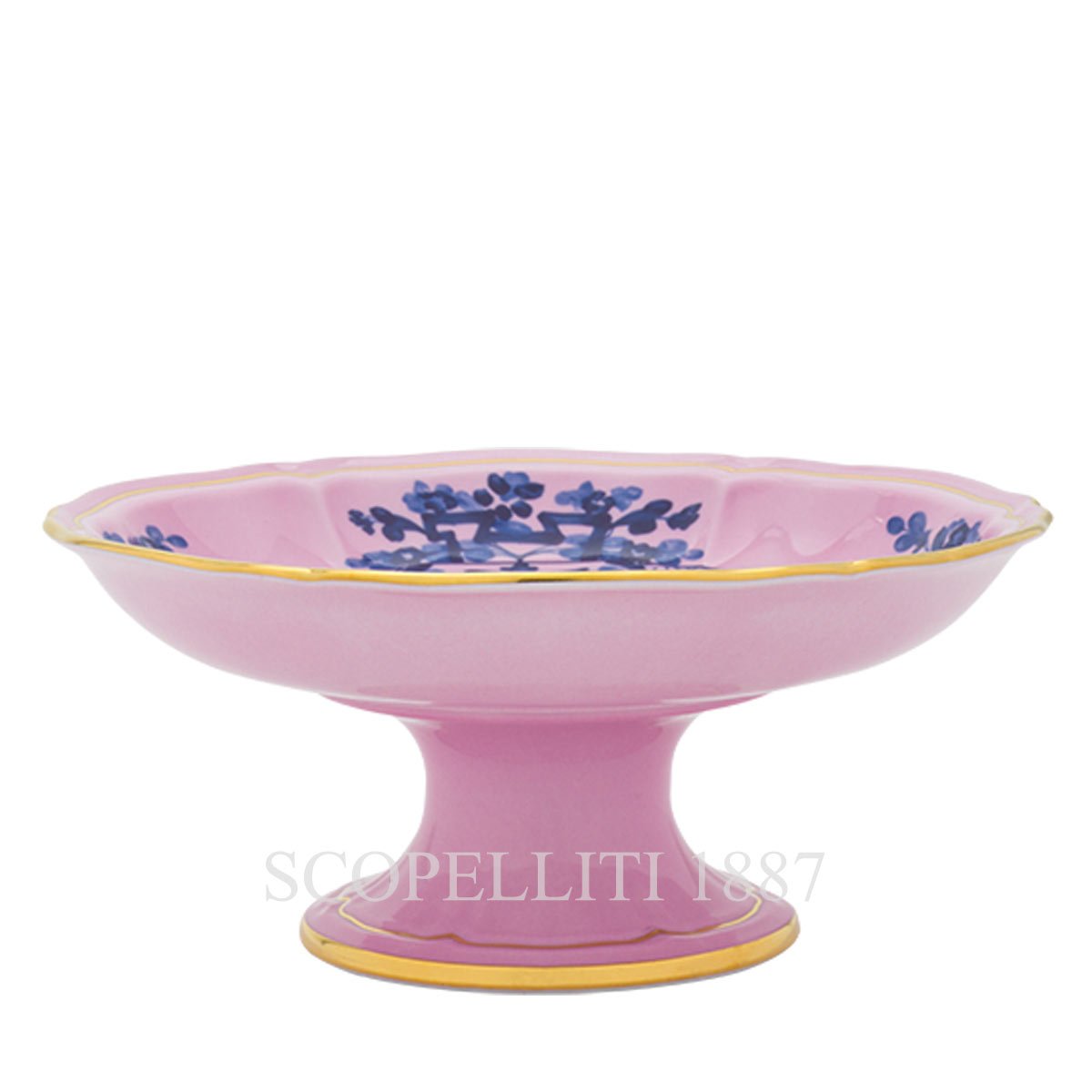 The Ginori 1735 Fruit Stand from the Oriente Italiano Azalea collection adds elegance and charm to any table setting, whether used for fruits, desserts, or as a decorative centerpiece. The intricate azalea pink porcelain and gold threading enhance the luxurious design, making it the perfect addition to a sophisticated dining experience. Adorned with the signature blue “carnation” motif, this fruit stand brings both beauty and function to the table, creating an exquisite display for fruits or desserts. The vibrant azalea pink contrasts elegantly with the delicate gold accents, reflecting the refined craftsmanship of Ginori 1735.