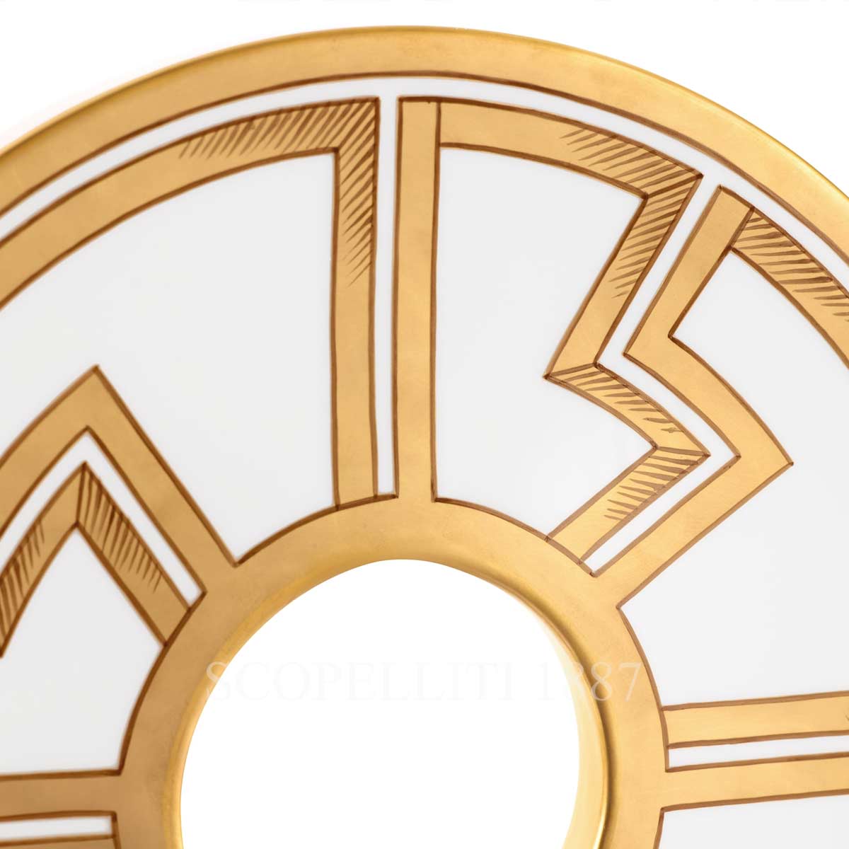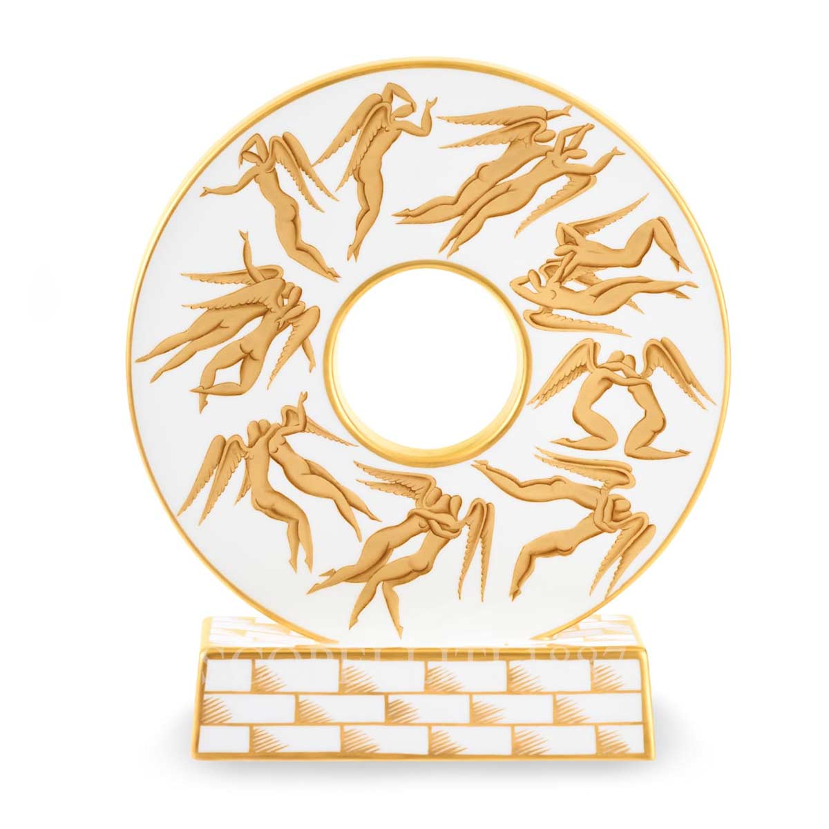 One of Gio Ponti’s most original inventions, the perforated disc was first conceived between 1928 and 1929. Originally produced in three different sizes, the form is reminiscent of the ancient Chinese bi disc used in funeral rituals, but it may also reference the monstrance used in Catholic liturgy. In both cases, Ponti plays with irony and sacred iconography, transforming spiritual symbols into a sophisticated design object. Ginori 1735 Gio Ponti Arte Disco Forato Angel’s Love is a collector’s item, created in a numbered series. The Angel’s Love pattern is emblematic of Ponti’s ability to blend esotericism, eroticism, and classicism into a harmonious visual language. The angels depicted are not traditional religious figures, but mythological beings—reminiscent of sirens—intertwined in sensual embraces. These ethereal creatures float across the gold-finished porcelain surface in a surreal composition, while the reverse side features geometric patterns echoing other themes in Ponti’s oeuvre. A fusion of creativity and function, the disc can serve as a striking decorative element or as a refined paperweight, perfect for elegant home or office settings. The bold presence and symbolic richness of this piece spark conversation and invite reflection on the thin boundaries between sacred and profane, art and utility. Ginori 1735 Gio Ponti Arte Disco Forato Angel’s Love entirely hand-painted and produced in a limited, numbered edition, each disc is signed under the base. With its luminous elegance and daring imagery, Amore degli Angeli reflects Ponti’s avant-garde vision, which helped define the identity of Ginori 1735 as a symbol of Italian excellence in design and craftsmanship. Still studied and admired today, his creations remain a benchmark in the world of decorative arts.