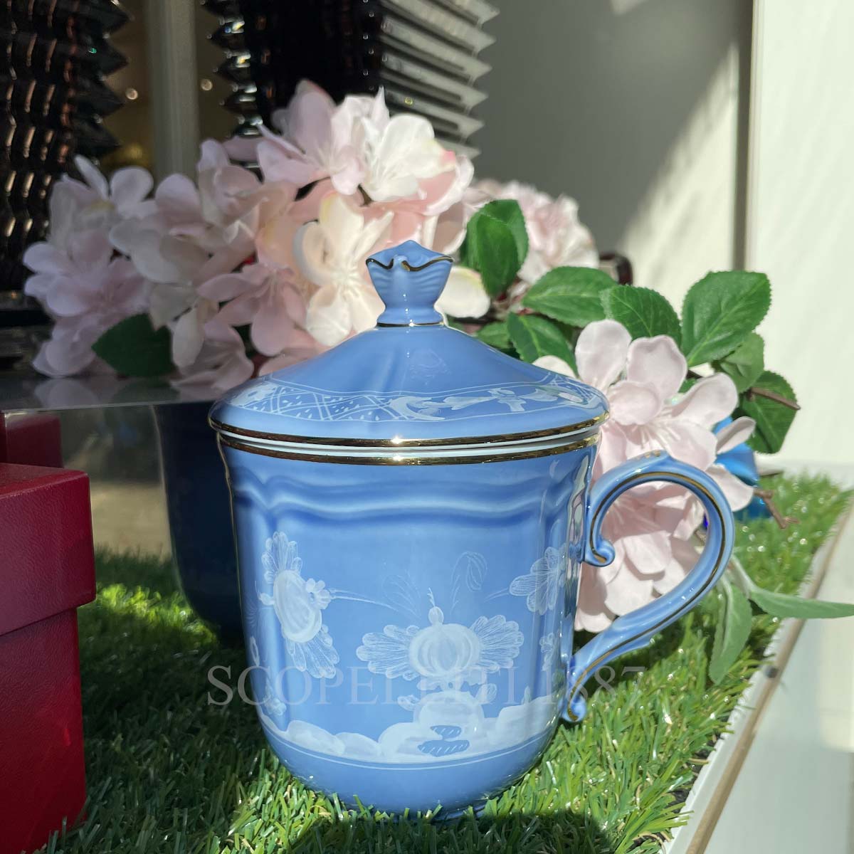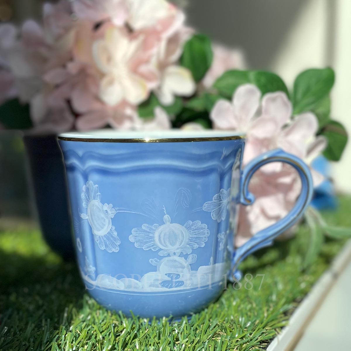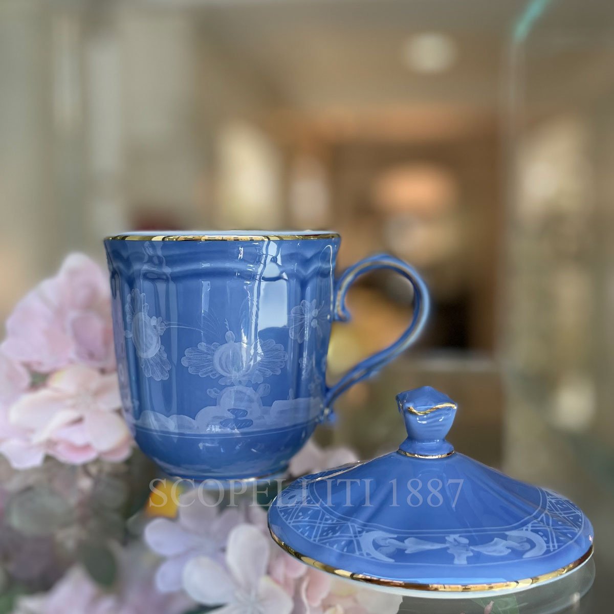 Enrich your table with the vibrant hues of the Ginori 1735 Mug with Lid Oriente Italiano Pervinca, a masterpiece of Italian craftsmanship. With a heritage dating back to 1735, Richard Ginori has been a symbol of excellence in porcelain making, combining traditional artistry with innovative designs. The Pervinca collection showcases the iconic Florentine “garofano” flower in a delicate, airbrushed effect, creating an ethereal aesthetic. The soft interplay of light blue and white, framed by 24-karat gold trim, exudes timeless elegance, making these pieces a captivating addition to any setting.