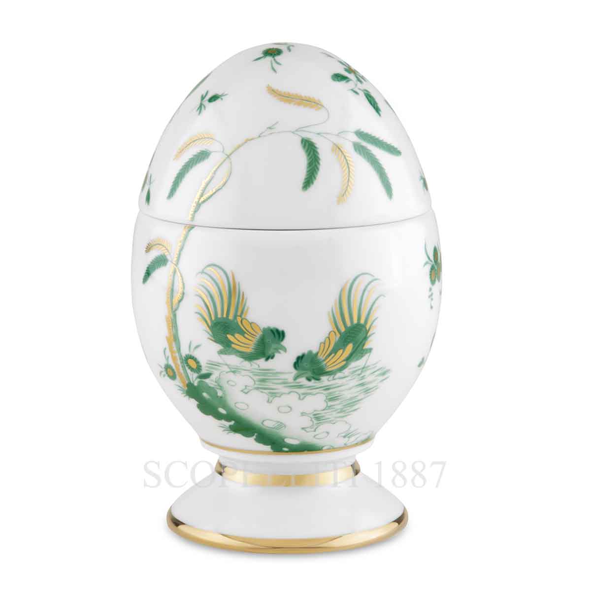 The Ginori 1735 Oro di Doccia Giada Large Egg is a striking decorative masterpiece crafted from fine porcelain. Featuring the rich Giada green hue and accented with delicate gold details, this large egg stands as an elegant symbol of luxury and craftsmanship. With its sophisticated design, this piece makes a bold statement, ideal for display in any refined setting or as part of a distinguished collection. Part of the Oro di Doccia collection, this large egg draws inspiration from the timeless floral motifs and Ji Ondori roosters originally conceived by the Florentine artist Ferdinando Campostrini in 1740. The intricate gold trim and elegant proportions celebrate Ginori’s unparalleled artistry and heritage. A perfect blend of artistry and heritage, this large egg exemplifies the fine craftsmanship and artistic legacy of Ginori 1735.