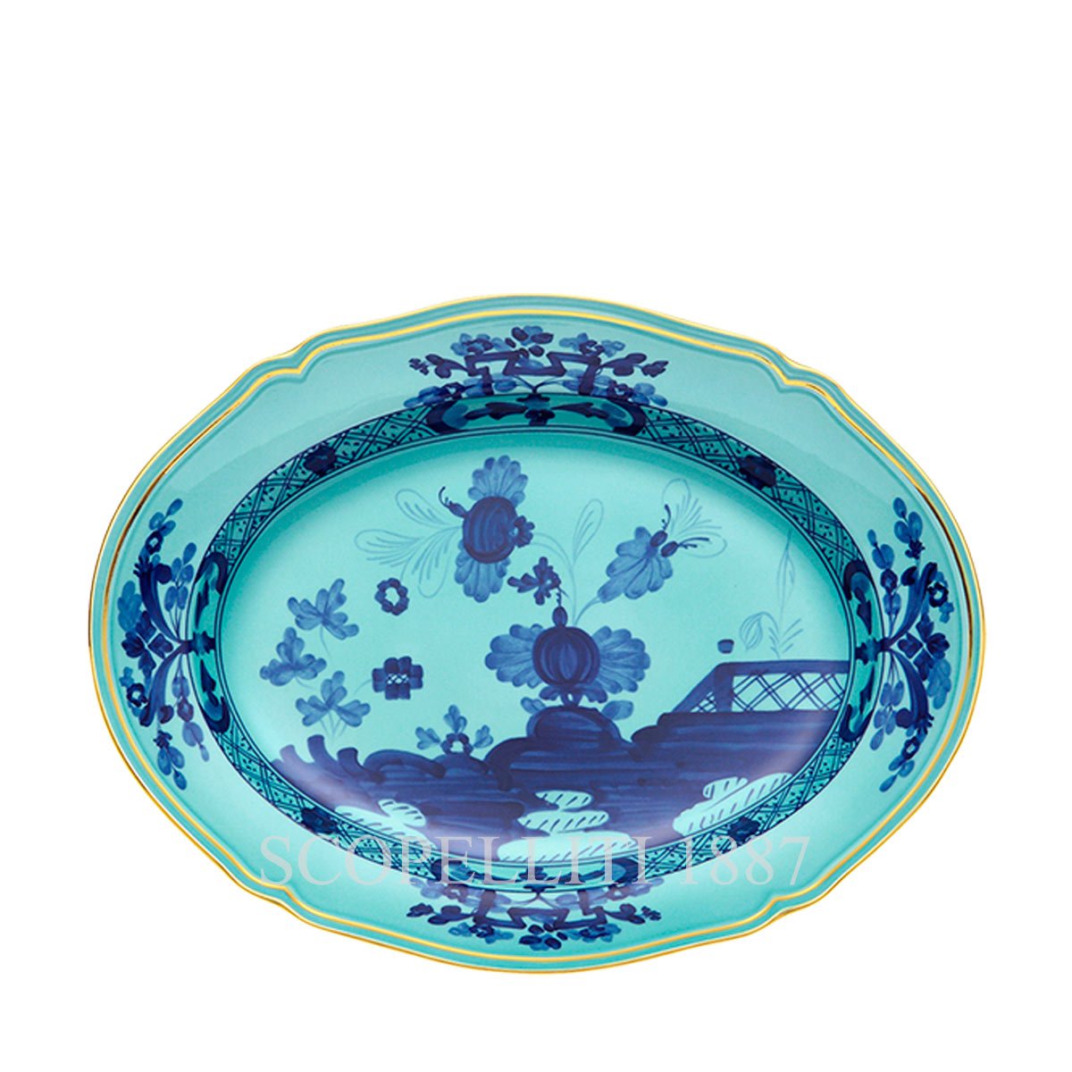 The Ginori 1735 Small Oval Platter from the Oriente Italiano Iris collection is a refined porcelain serving dish, adorned with a delicate blue “carnation” floral motif on an iris blue background. The gold threading gracefully outlines its Antico Doccia shape, adding a touch of timeless elegance to your table setting. Perfect for serving appetizers, side dishes, or delicate gourmet creations, this versatile platter enhances both formal and everyday dining experiences. Whether combined with other pieces from the Oriente Italiano collection or used as a standalone statement, it embodies the excellence of Italian craftsmanship.
