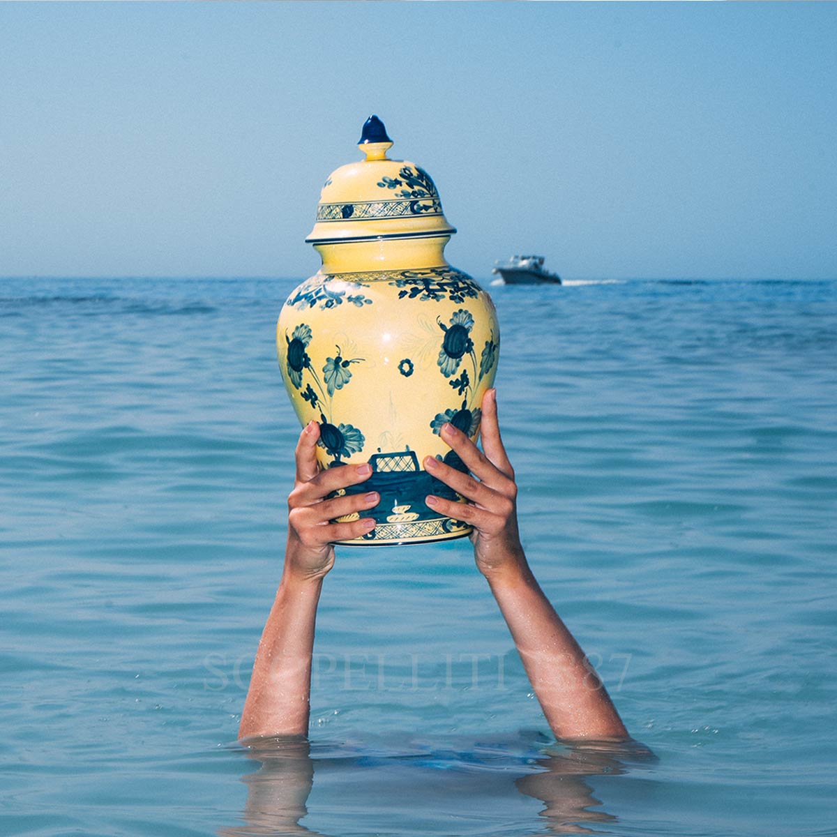 The Ginori 1735 Potiche Large Vase With Cover Oriente Italiano Citrino is a striking porcelain creation that fuses heritage craftsmanship with modern luxury. Ginori 1735 Potiche Large Vase With Cover Oriente Italiano Citrino featuring the iconic blue “carnation” motif against a radiant citrine yellow background, this lidded vase exudes timeless elegance and grandeur. This grand potiche vase is a stunning focal point for luxurious interiors, perfect for displaying as a centerpiece or enhancing shelves, consoles, or mantelpieces with a touch of refined artistry. Its elegant curved silhouette and removable lid make it a versatile decorative element for any sophisticated setting.