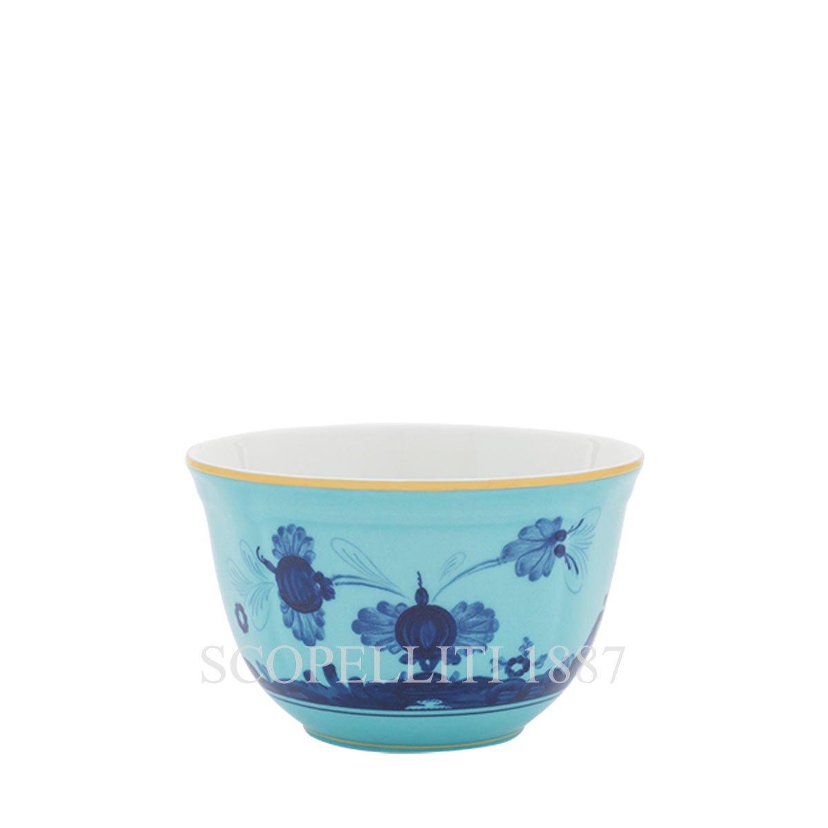 Enjoy your meals in style with the Ginori 1735 Rice Bowl Oriente Italiano Iris, an exquisite piece from the Oriente Italiano collection that combines Italian porcelain craftsmanship with Eastern decorative influences. This Iris rice bowl features the iconic carnation floral motif in blue, contrasted against the delicate iris blue porcelain. The design is further enhanced by gold threading that adds a touch of elegance to its sinuous shape. Whether serving rice, soup, or other Asian-inspired dishes, this bowl brings sophistication to every table. The Oriente Italiano collection offers a wide range of tableware, allowing you to mix and match pieces for a unique and personalized dining experience. Its versatile design, available in several colors, adds a contemporary and vibrant touch to your table setting.