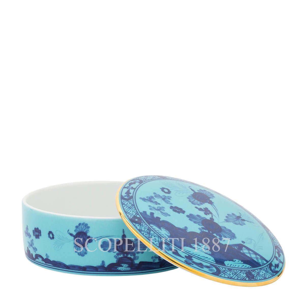 The Ginori 1735 Round Box With Lid Oriente Italiano Iris is part of the celebrated Oriente Italiano collection, a tribute to the finest Italian porcelain artistry. This collection masterfully combines Eastern decorative influences with the unmistakable elegance of Italian design. From dinnerware to tea and coffee sets, each piece in the Oriente Italiano range is adorned with vibrant hues and intricate gold detailing, creating a joyful and sophisticated table setting. The collection’s unique color palette, ranging from soft pastels to bold, vivid shades, allows for endless creative combinations, transforming any occasion into an extraordinary visual experience. Bring home the magic of Oriente Italiano and elevate your décor with a timeless masterpiece.