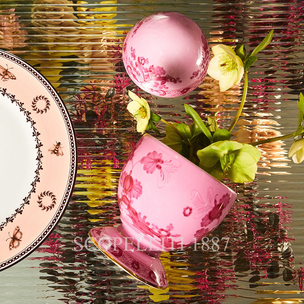 The Oriente Italiano collection is a fusion of Eastern decorative influences and Italian porcelain mastery, offering a rich palette of vibrant and pastel tones. Each piece showcases intricate floral patterns, creating an atmosphere of luxurious charm and refined artistry in any setting.