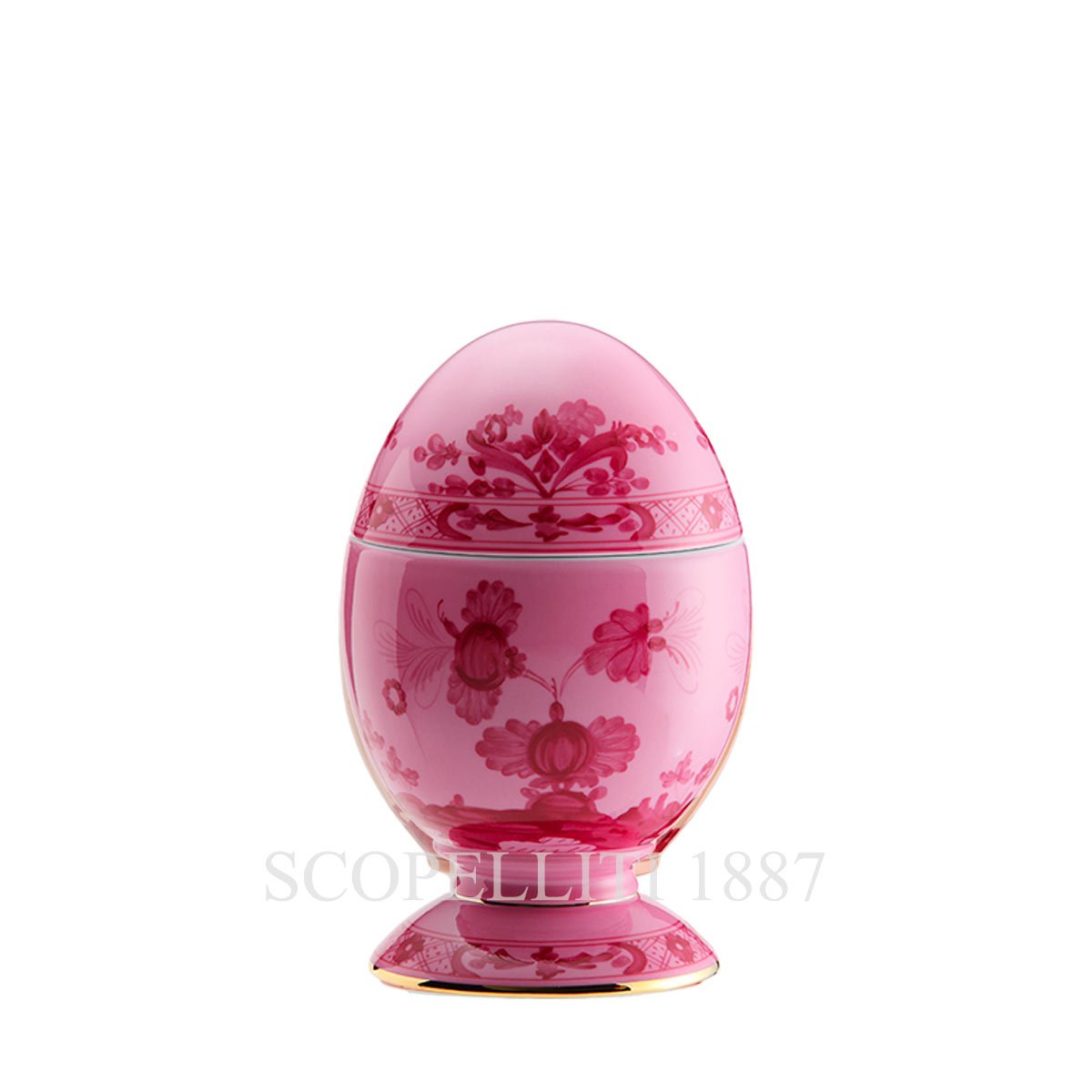 The Ginori 1735 Small Covered Egg Oriente Italiano Porpora is a refined porcelain piece, combining exquisite craftsmanship with timeless elegance. This delicate covered egg is a symbol of sophistication and artistry, featuring the deep Porpora hue that enhances its elegant floral motifs. Perfect as a decorative accent or for storing small treasures, it seamlessly fits into classic and contemporary interiors alike. A thoughtful gift for those who appreciate fine porcelain and timeless beauty.