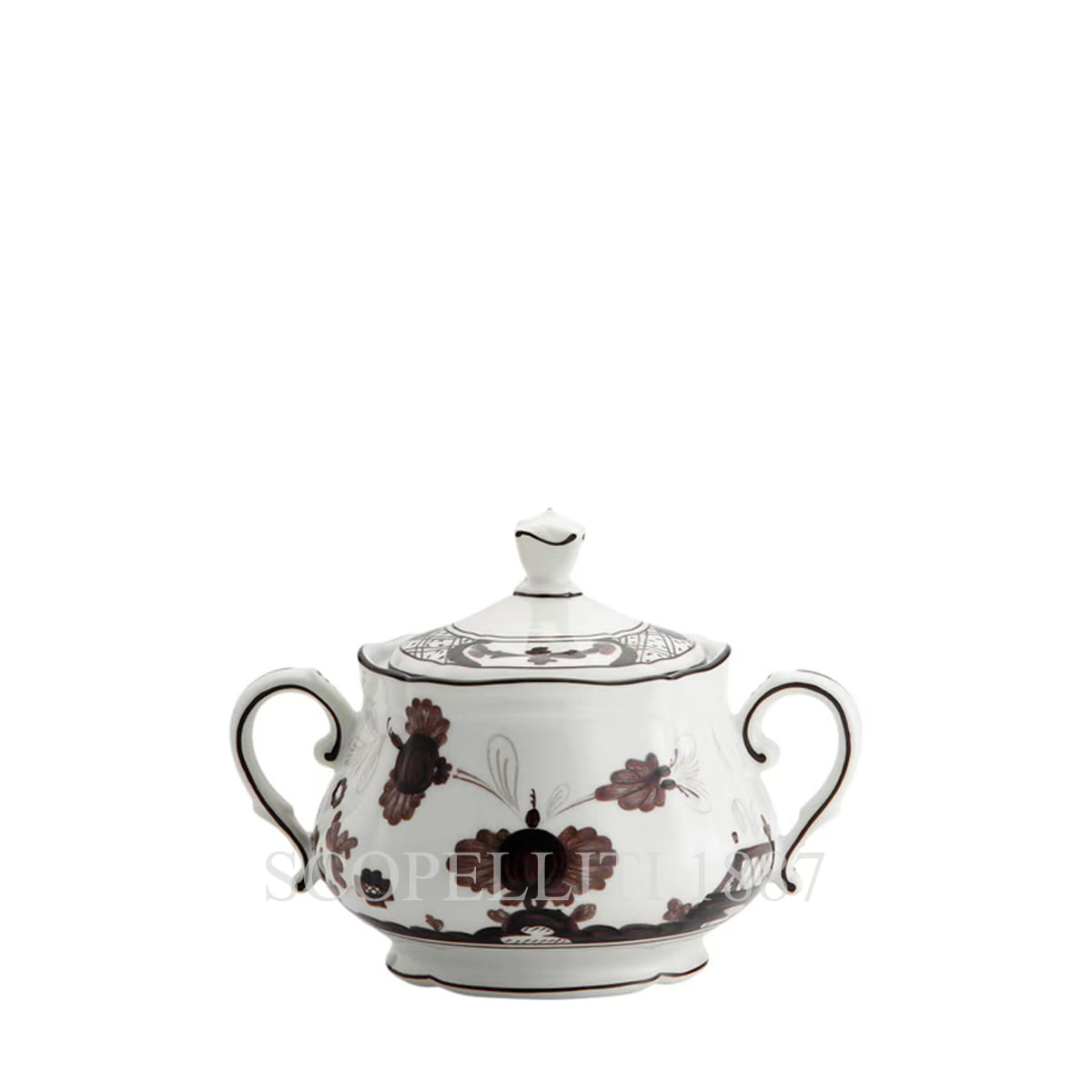 The Ginori 1735 Sugar Bowl with Lid Oriente Italiano Albus is a refined piece from the Oriente Italiano collection, crafted with precision and elegance. Made from Albus porcelain, this sugar bowl features the iconic Garofano (carnation) motif in black, offering a striking contrast to the smooth white porcelain. The piece is complemented by a delicate lid that adds a touch of sophistication and functionality to any table setting. The Ginori 1735 Sugar Bowl with Lid Oriente Italiano Albus is a versatile and elegant addition to your collection, perfect for serving sugar or other small treats in style. It complements other pieces from the Oriente Italiano collection, adding a sophisticated touch to any tea or coffee service.