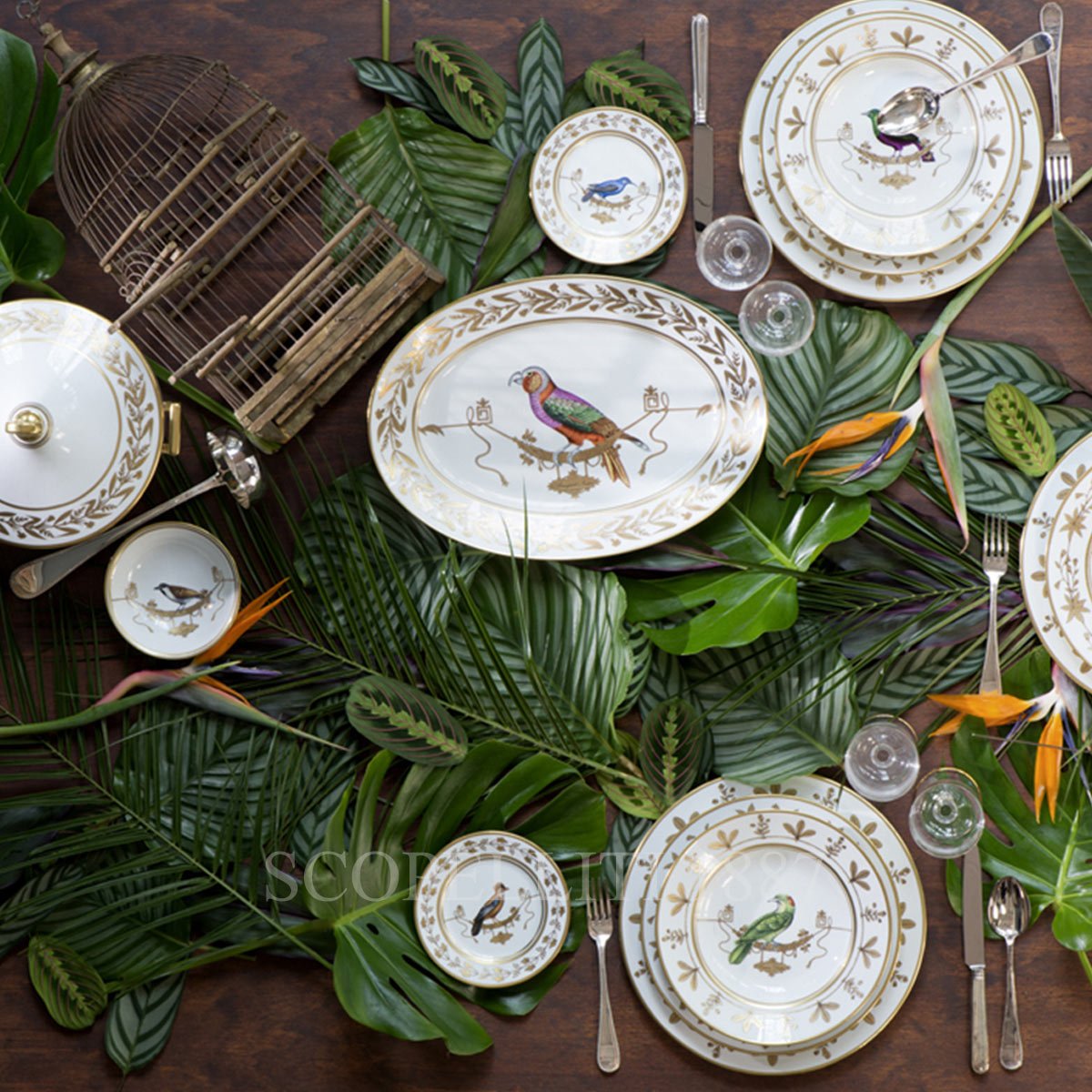Pure beauty and natural charm characterize Volière, a collection which epitomizes the masterful craftsmanship and artistic heritage of Richard Ginori. The collection’s designs, featured on the signature Empire shape, are inspired by 19th-century botanical drawings, skillfully reproducing twelve species of birds perched on intricate festoons. Surrounded by golden tendrils, twelve different bird motifs unfold their own life: each one is lifelike right down to the feathers. In polished gold not only the foliage is finely graduated, each bird also carries its elaborately decorated name plate. The images are framed by floral motifs delicately highlighted with pure gold edging. Each figure is split up into different elements and colors, reproducing every hue, detail and colorful marking with a palette of more than fifty shades. The over glaze, applied using a special firing process, protects the pigments’ sheen. Every single item of these cups and plates is masterly handmade in many different operations and then carefully checked, as a masterpiece from the Italian manufactory goes without saying.