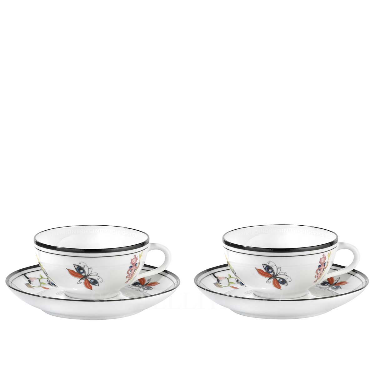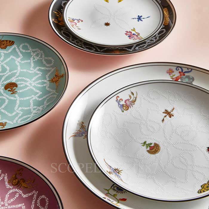 Each Arcadia porcelain piece depicts some of the fantastic characters in the collection. Lumachino graces the bread plates, a half-imp, half-snail creature who bestows a tiny emerald upon those he chances to meet, and Zazello appears as well, a little devil who spreads love by stinging with his trident. Arcadia is a wonderful collection of tableware, tea and coffee items that ties together design, art and fantasy. Ginori 1735 created it in collaboration with fashion designer Orazio Stasi, bringing to life the depictions in his vivid imagination. Arcadia, a fantastic and idyllic world, was born out of his flair for the creative. In this place, reminiscent of childhood, joyful creatures with mixed up features flit about, wandering among the floral elements of an Italian garden, leaving happiness in their wake.