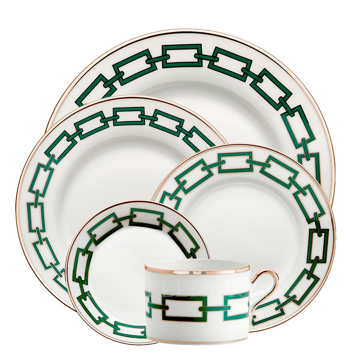 Ginori 5 piece place setting Catene Green is a dinner set that includes 1 each of the Dinner Plate, Dessert Plate, Bread & Butter Plate and Tea Cup with Saucer. Each piece is embellished with lustrous gold trim. A very young Gio Ponti served as the artistic director of the Manifattura from 1923 to 1933, an incredible decade during which the legendary designer reimagined the art of working with porcelain by translating the legacy of artisan knowledge into new languages that remain contemporary even today. In 1926 many designs took shape out of his irrepressible creativity. Among these, a decoration made up of rectangular rings linked to one another. A chain, indeed. Sophisticated and elegant in its essentiality, but also explosive and disruptive in its geometric movement. Perfect for all occasions, Ginori 5 piece place setting Catene Green will add a touch of beauty every time you use them. The Catene collection is available in a palette of four bright colors: Red, Green, Blue and Black. Please note, each Richard Ginori 5 piece Place Setting is unique and has been hand decorated by artisans.