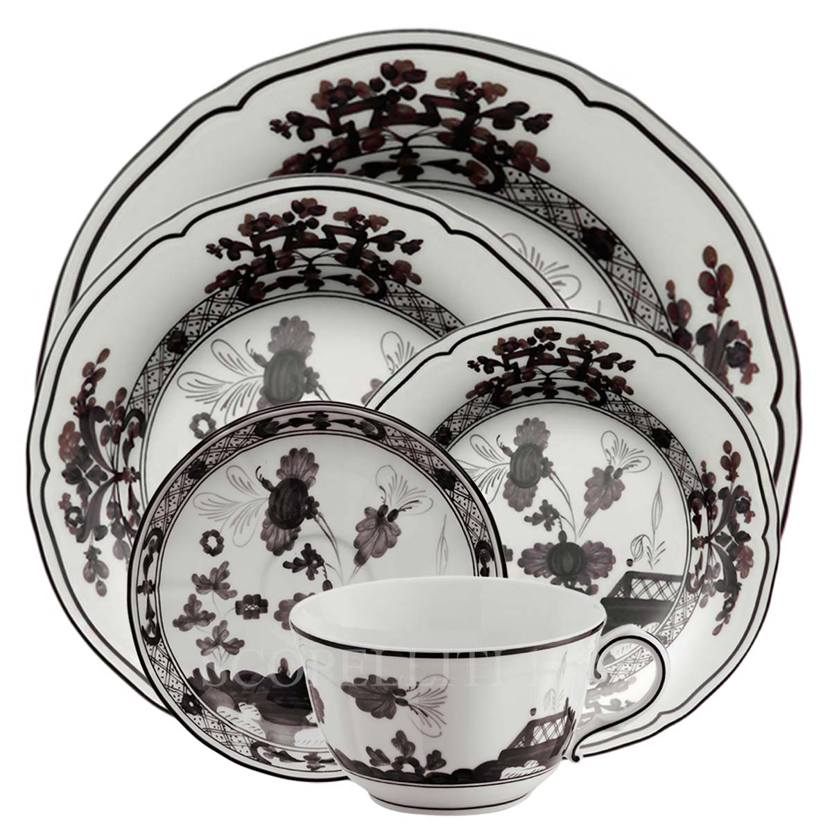 Ginori 5 piece place setting Oriente Italiano Albus is a dinner set that includes 1 each of the Dinner Plate, Dessert Plate, Bread & Butter Plate and Tea Cup with Saucer. Oriente Italiano is a colorful collection of tableware, tea and coffee sets and home décor items that embodies in its vast assortment the artisan passion that has been a hallmark of the brand for nearly three centuries. A passion by which it has been driven to great heights, daring in the study of colors to be applied to porcelain pieces and in quest for designs that have marked the history of Made in Italy style. Each Ginori 1735 Oriente Italiano piece bears the “carnation” floral motif dating back to the ceramic tradition of Faenza. It was reinterpreted in own style applied using the most refined artisan techniques. The collection is available in a palette of ten vibrant colors: Malachite, Albus, Vermilion, Barium, Periwinkle, Powder, Mauve, Azalea, Citrine and Iris.