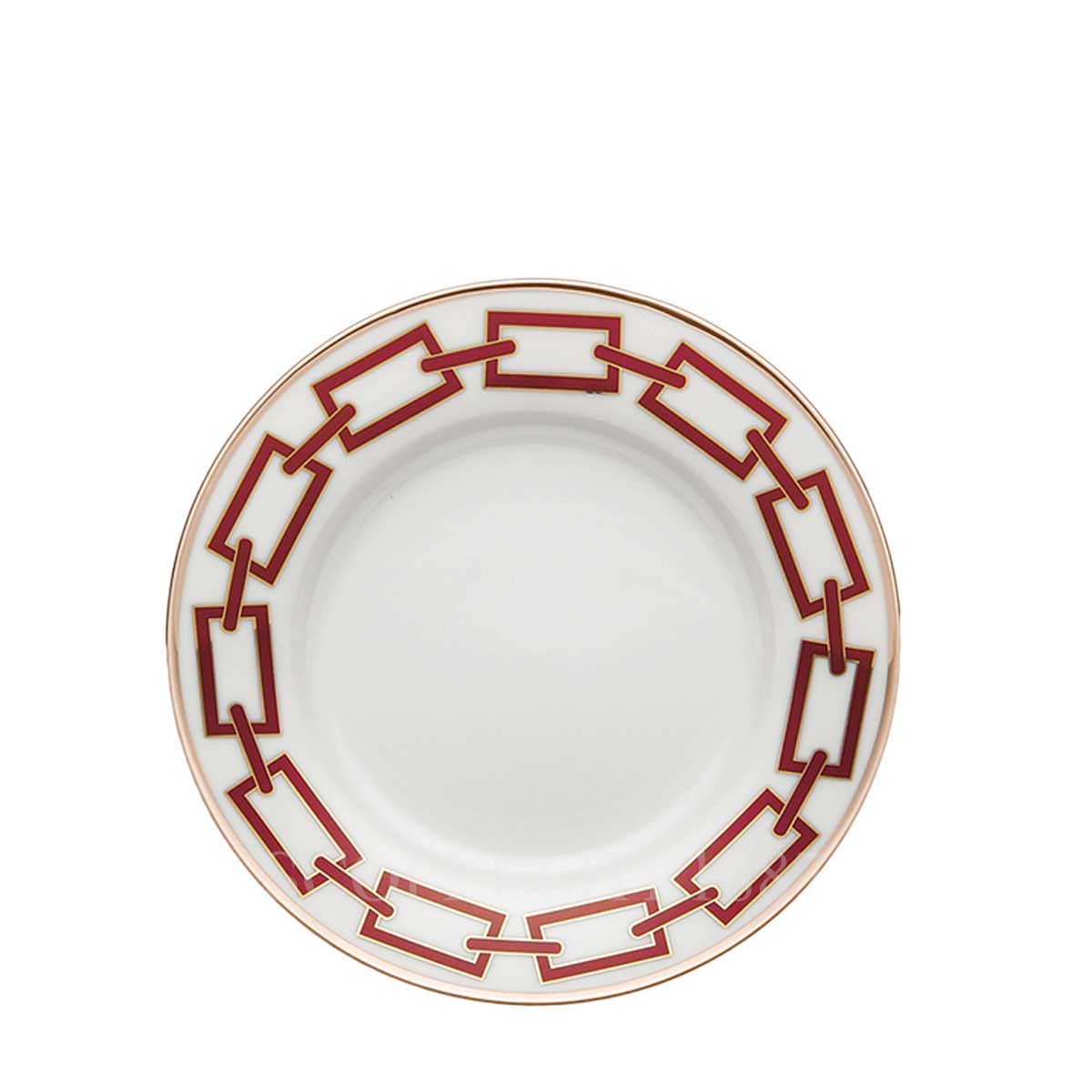 Elegant and essential, the Ginori Bread Plate Catene Red is perfect for serving bread, appetizers, or small treats with a refined flair. Designed by Gio Ponti, the red geometric chain pattern is both bold and sophisticated, highlighted by a platinum rim that adds a luxurious touch. Ideal as part of a complete table setting or as a statement piece on its own.