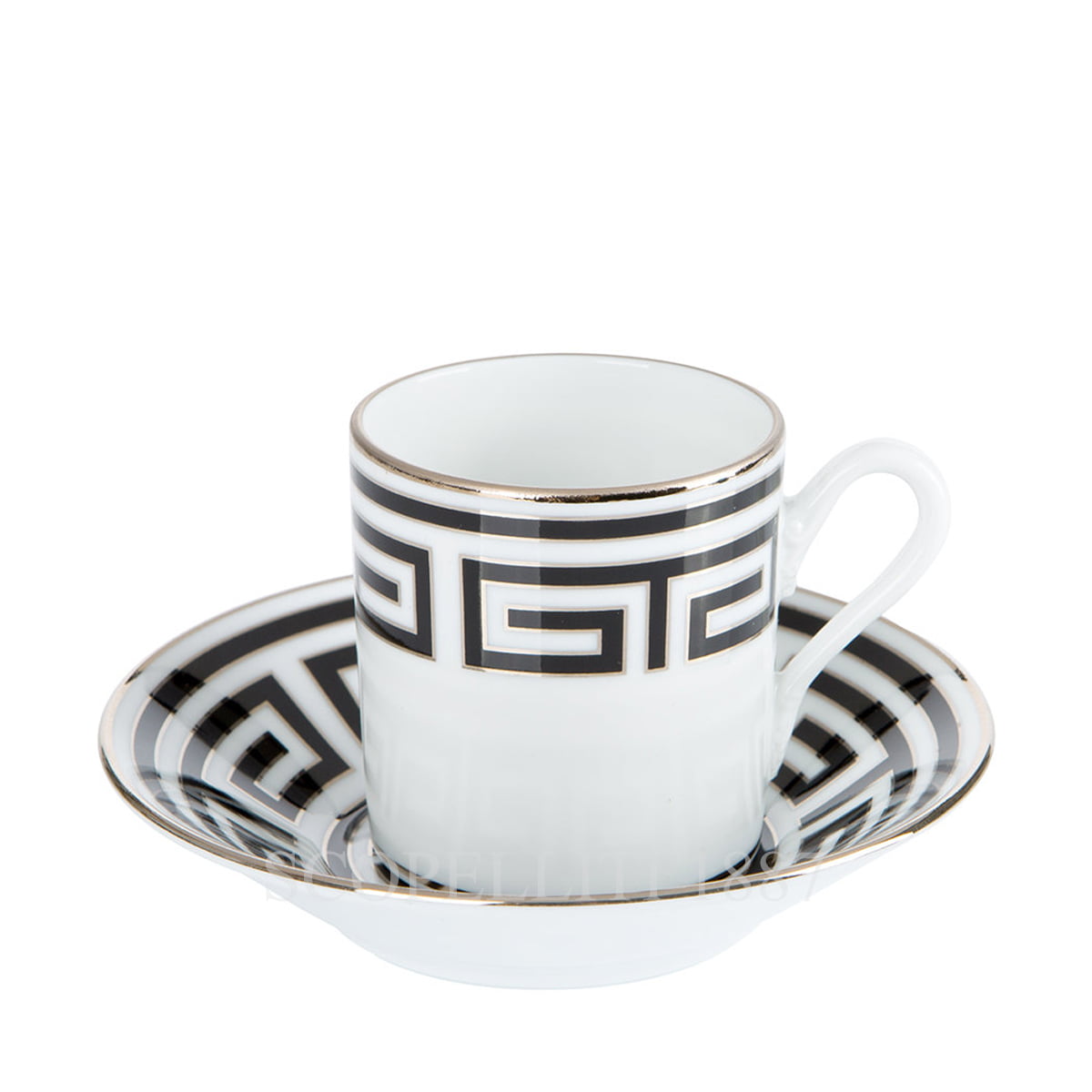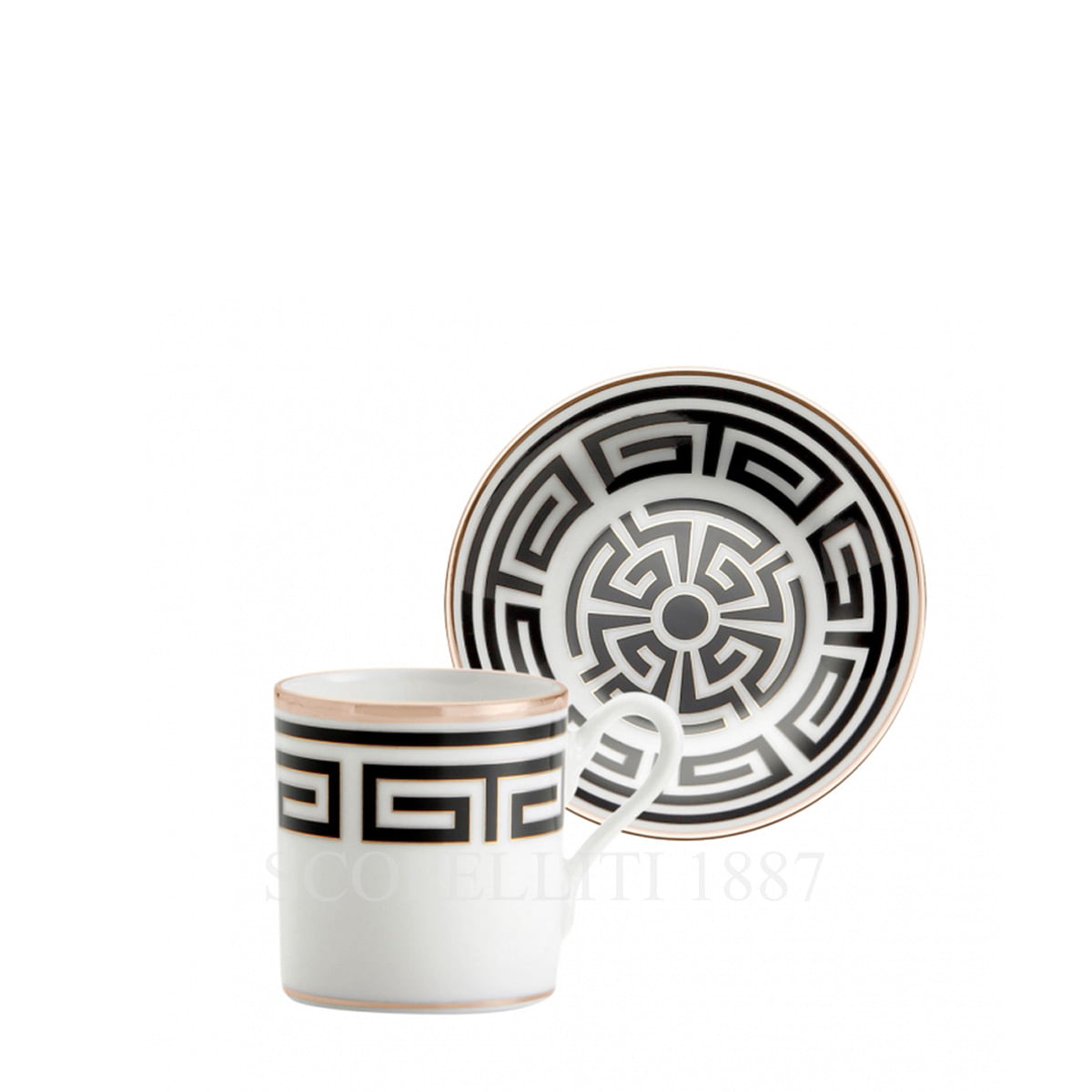 The Ginori Coffee Cup and Saucer Labirinto Black embodies refined Italian craftsmanship. Adorned with Gio Ponti’s timeless labyrinth motif in black and highlighted with platinum, this elegant set enhances your espresso experience with a touch of luxury.