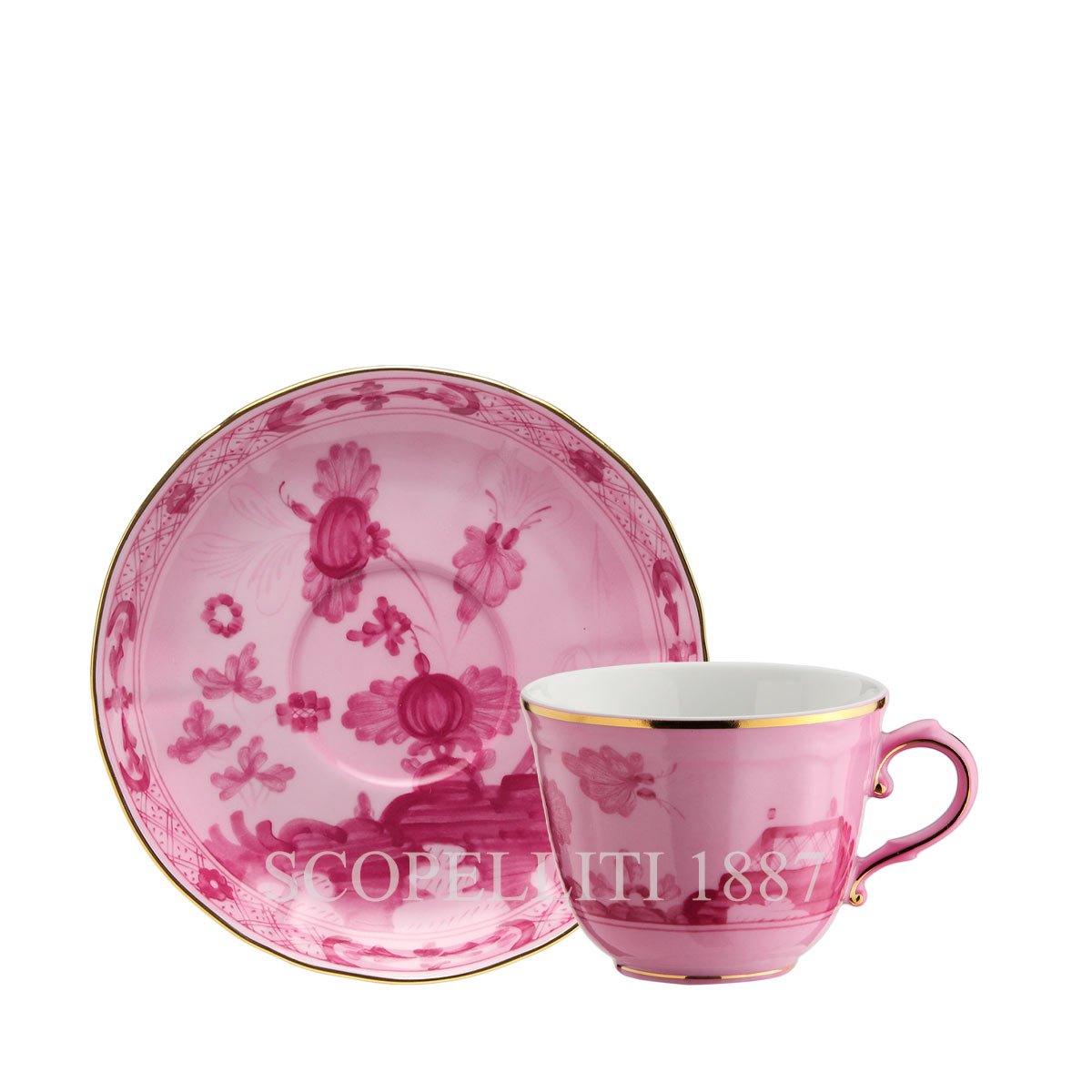 The Oriente Italiano collection from Ginori 1735 combines Eastern decorative influences with the finest Italian craftsmanship. The Porpora pattern boasts a delicate blend of rich tones and intricate floral motifs, making this coffee cup and saucer set a unique statement piece for any occasion. Whether for everyday use or special moments, this set will enhance your coffee experience with refined style.