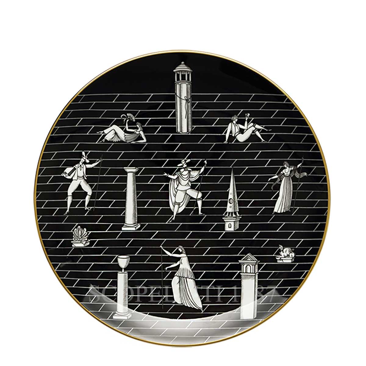 The Ginori Gio Ponti Plate Passeggiata Archeologica Black is a masterpiece that reinterprets classical design through the lens of Gio Ponti’s vision. Inspired by the 18th-century Grand Tour and the Roman excavations along the “Passeggiata Archeologica” route, the decoration beautifully portrays figures in a spatial dimension, enhanced by the perspective of a tiled floor. This version of the plate, with its bold black background, is produced with the decal technique, and the gold detailing is carefully applied by hand after the firing process. The design’s intricate detail and luxurious finish make it a perfect addition to any collection. Part of the Arte di Gio Ponti collection, this plate reflects Gio Ponti’s lasting influence on Ginori 1735, where his innovative designs contributed to the brand’s international prestige.