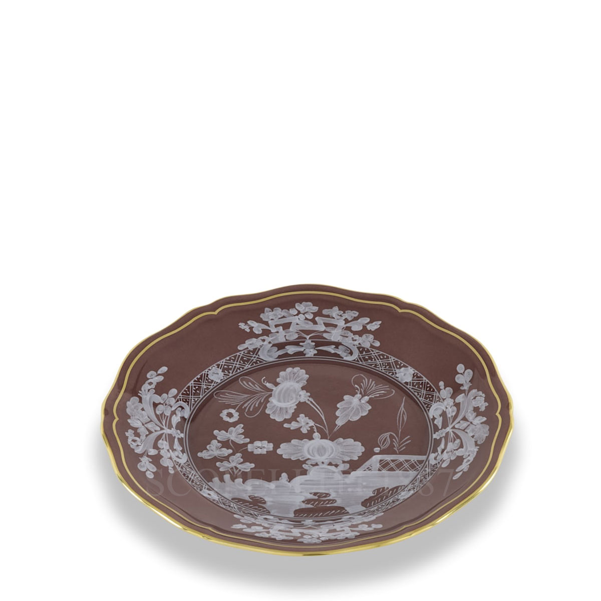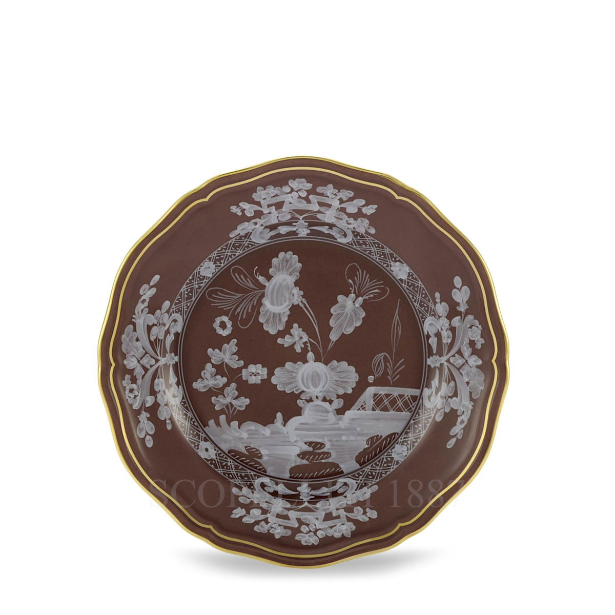 The Ginori 1735 Oriente Italiano Castagna Bread Plate is a true masterpiece, meticulously crafted from fine porcelain and adorned with delicate white patterns and an elegant gold thread detailing. The warm, earthy Castagna brown hue adds a sense of richness and sophistication, embodying the timeless beauty of the Oriente Italiano collection. This exquisite bread plate is not just a functional piece, but a statement of refined taste and elegance. Perfect for serving freshly baked bread rolls, crispy breadsticks, or light appetizers, it enhances any dining experience. Whether it’s a casual breakfast with loved ones, a formal dinner, an afternoon aperitif, or a leisurely brunch, the Ginori 1735 Oriente Italiano Castagna Bread Plate brings an element of understated luxury to every occasion. For a truly harmonious and sophisticated table setting, pair this bread plate with other pieces from the Oriente Italiano collection, such as matching dinner plates, soup plates, and elegant place settings. The interplay of the Castagna, Meringa, and Porpora tones offers endless possibilities for creative and striking color combinations, allowing you to tailor your table setting to reflect your personal style. Each piece in the Ginori 1735 Oriente Italiano collection is an artistic treasure, with its intricate floral motifs and vibrant colors that capture the essence of Italian craftsmanship. Whether you are hosting an intimate dinner or a grand celebration, this bread plate, along with the rest of the collection, will impress and delight your guests, turning every meal into a memorable visual and culinary experience. With its timeless design and impeccable craftsmanship, the Ginori 1735 Oriente Italiano Castagna Bread Plate is an essential piece for anyone who appreciates the art of fine dining.