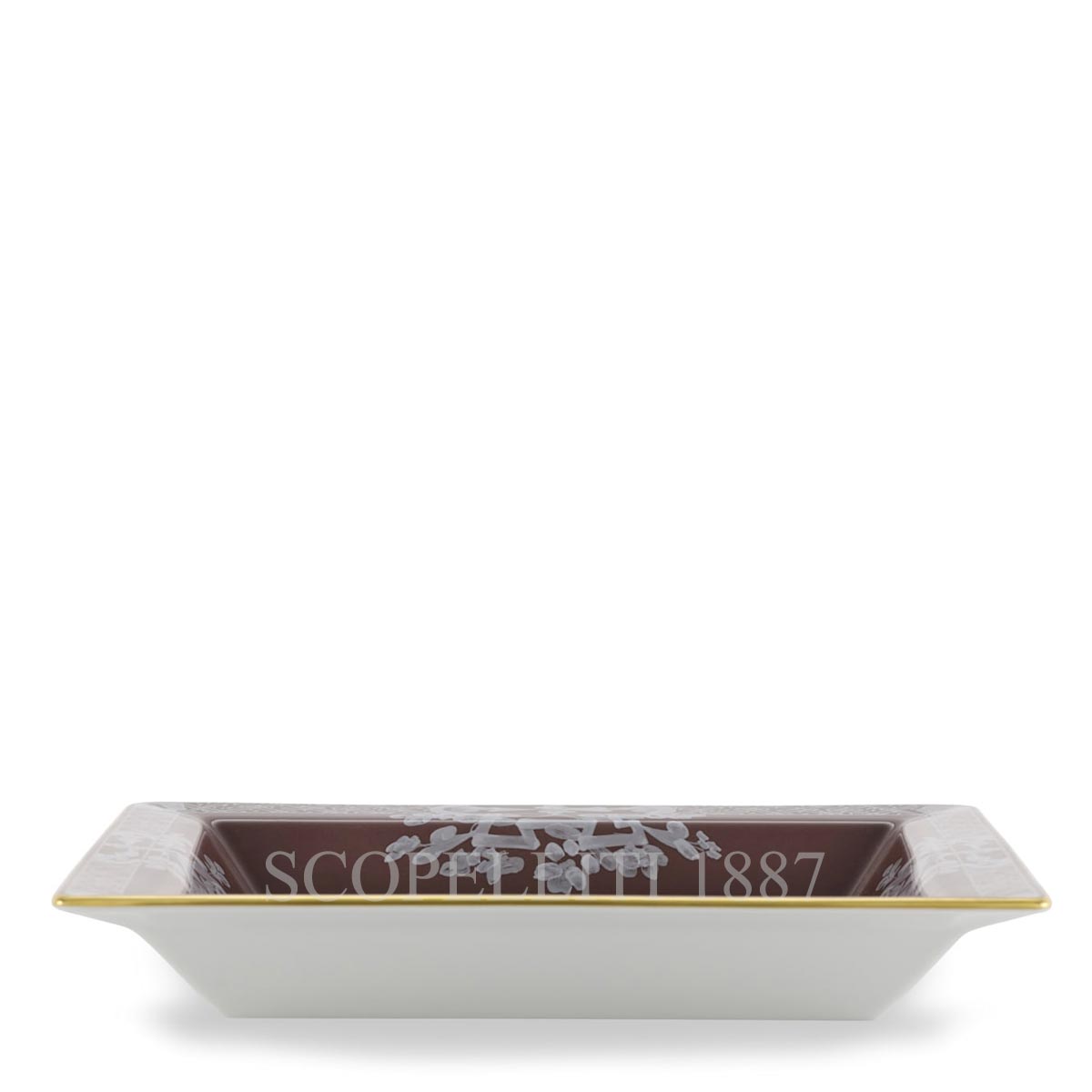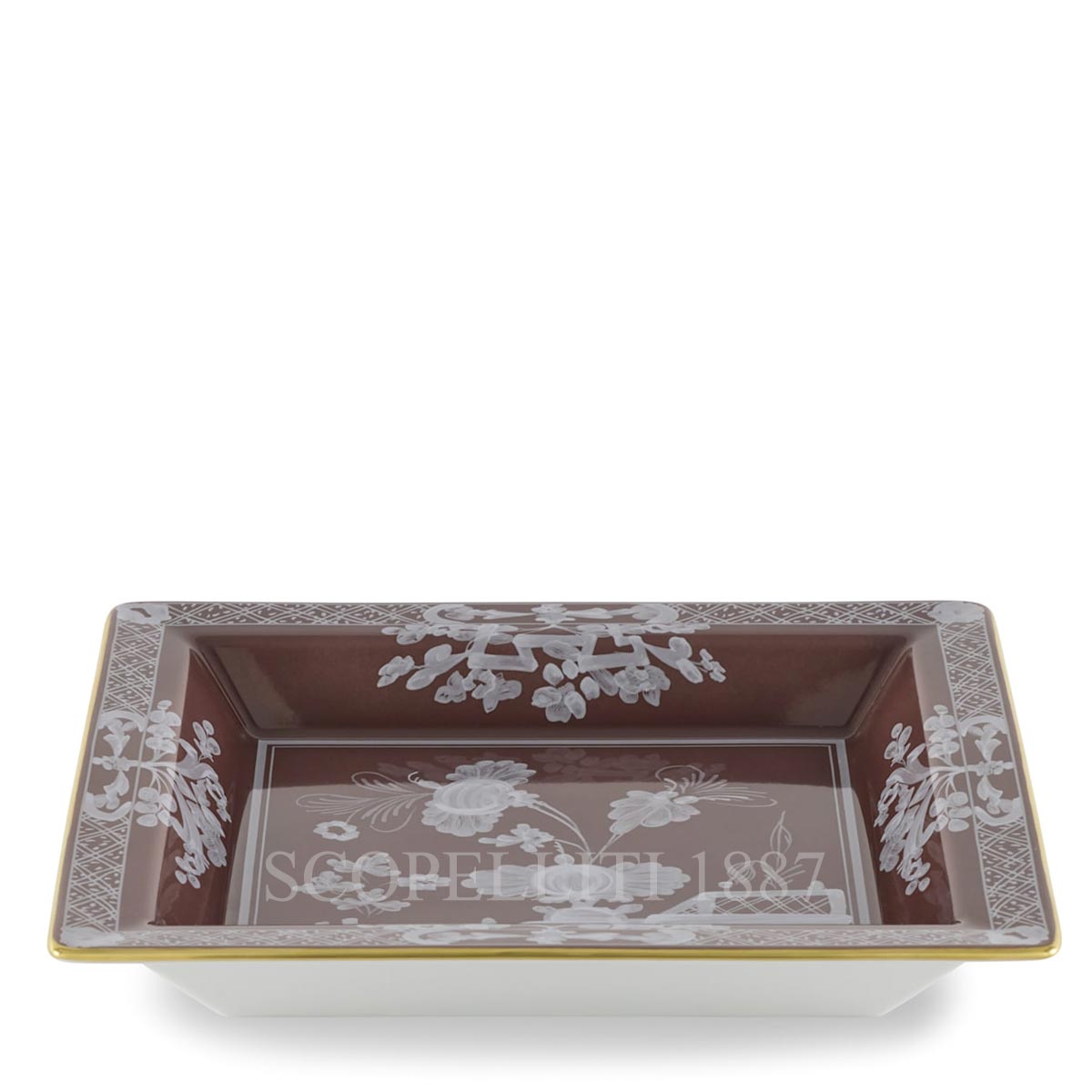 The Ginori 1735 Oriente Italiano Castagna Change Tray is an exquisite porcelain piece, featuring the warm brown hue and delicate gold threading. This large square tray from the Ginori 1735 Oriente Italiano collection adds sophistication and versatility to any space, effortlessly complementing both classic and contemporary settings. Ideal for use at the entrance, the Ginori 1735 Oriente Italiano Castagna Change Tray offers a refined place to store keys, coins, and small everyday items. On your desk, it becomes a stylish trinket tray, contributing to a more organized and elegant workspace. It also serves beautifully on the table, perfect for serving finger foods or as a tasteful accent to elevate even the simplest mise en place. For a striking decorative effect, pair it with designer candles or porcelain vases from the same collection to create a stunning centerpiece. Presented in an elegant luxury box, the Ginori 1735 Oriente Italiano Castagna Change Tray makes an exceptional gift that seamlessly blends elegance with functionality. Crafted with the renowned expertise of Florentine artisans, each piece from the Ginori 1735 Oriente Italiano tableware is a work of art that will elevate any home with its timeless style.