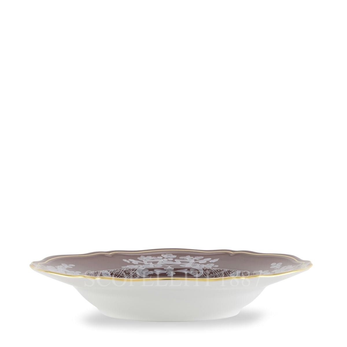The Ginori 1735 Oriente Italiano Castagna Soup Plate brings warmth and elegance to any table, featuring a rich brown color accented with delicate white motifs and a refined gold rim. This stunning soup plate enhances even the simplest dishes, from seasonal soups to creamy risottos, transforming every meal into a sophisticated occasion. Its inviting design creates a serene atmosphere, perfect for leisurely meals and meaningful gatherings. The exceptional craftsmanship and timeless design of the porcelain plates in this collection make them ideal for elegant table settings. The delicate white floral ornament, inspired by the Garofano (Carnation)—a symbol of passion and artistic dedication—beautifully contrasts with the soft brown hue, adding an extra layer of sophistication. For a creative twist, the Ginori 1735 Oriente Italiano Castagna Soup Plate can be used in unexpected ways. It makes an elegant base for a candle centerpiece or a beautiful vessel for fragrant potpourri or dried flowers. When placed in a living room or bedroom, it becomes a charming decor piece, adding a touch of luxury and a subtle fragrance to the space. The collection also includes placeholders, dinner plates, side plates, and bread plates, all crafted from the exquisite Oriente Italiano porcelain. These pieces are available in the rich Castagna version, with pure white accents on fine brown porcelain, and can be paired with other items from the Oriente Italiano line to create unique and personalized color combinations. To craft a table setting that’s both playful and sophisticated, combine the Oriente Italiano Castagna Soup Plate with other pieces from the dinnerware. Pair it with the subtle elegance of Meringa or the bold allure of Pervinca to create a dynamic, personalized arrangement. Each color combination offers a distinct expression of style, allowing you to showcase your individual taste and elevate your dining experience.