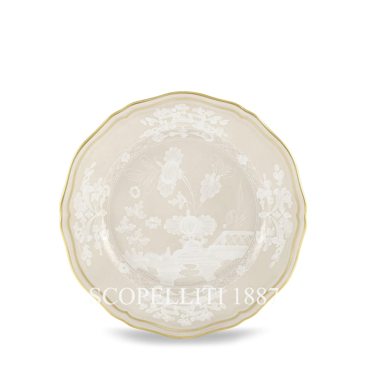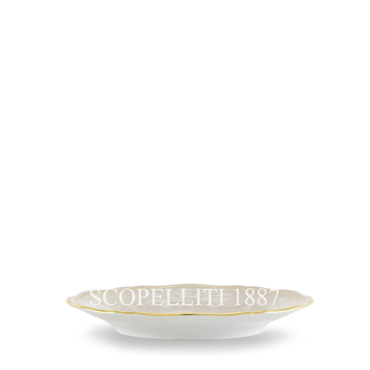 The Ginori 1735 Oriente Italiano Meringa Bread Plate, crafted in fine porcelain with a warm beige hue, features delicate white motifs accented by an elegant gold trim. This refined bread plate from the Ginori 1735 Oriente Italiano collection adds a touch of understated sophistication to every meal, whether for breakfast, dinner, aperitifs, or brunch. Perfectly suited for serving fresh rolls and breadsticks, the Ginori 1735 Oriente Italiano Meringa Bread Plate enhances any table setting with its subtle yet unmistakable charm. For a harmonious and refined mise en place, pair this bread plate with other tableware pieces from the same collection, such as name card holders, soup plates, and dinner plates. To create a unique palette, combine the soft beige Meringa with the rich Castagna and Porpora shades for a delightful blend of neutrals and pink tones. The Ginori 1735 Oriente Italiano Meringa Bread Plate, with its exotic patterns and vibrant colors, encourages endless creativity, allowing you to create unique and personalized table settings that make every dining experience a visual delight.