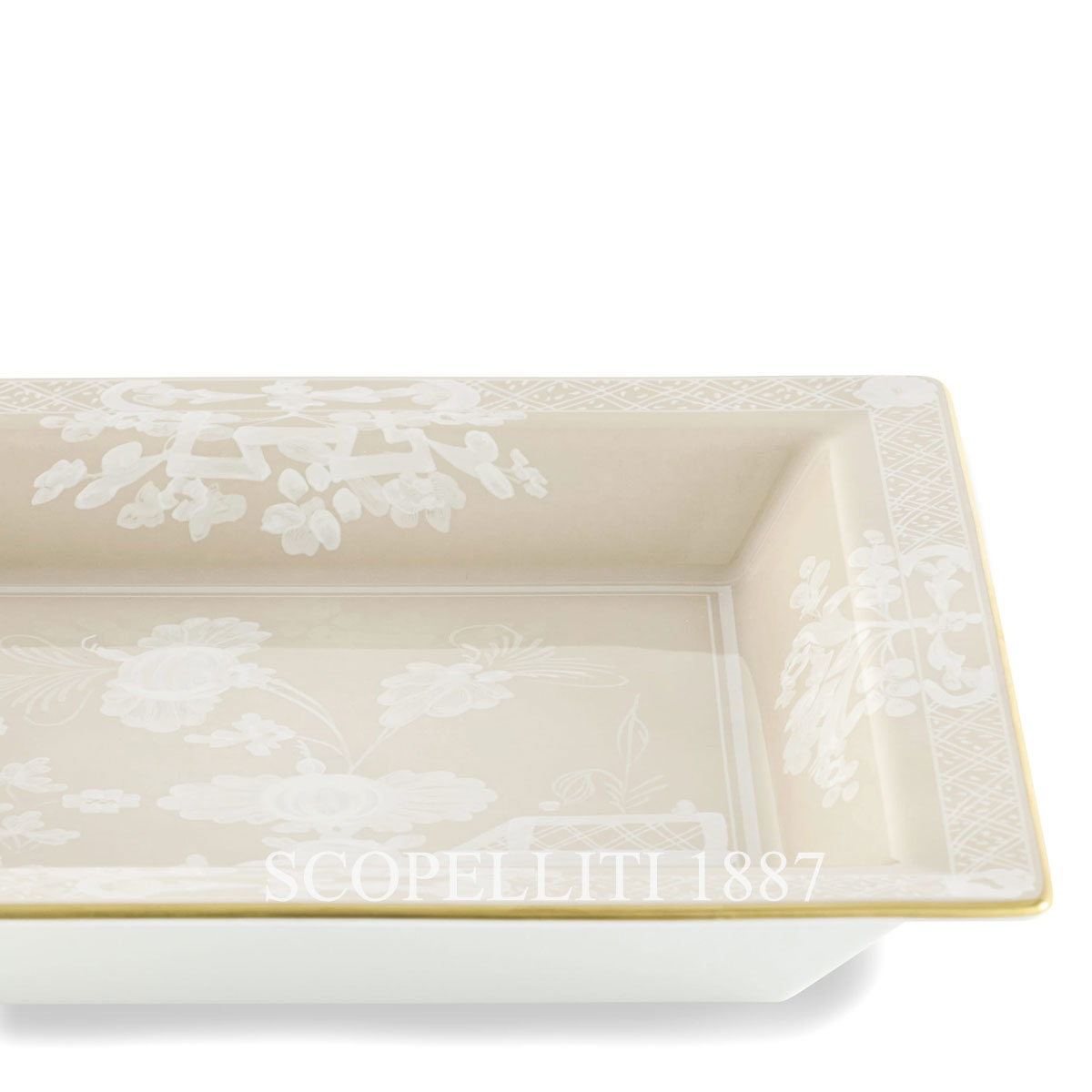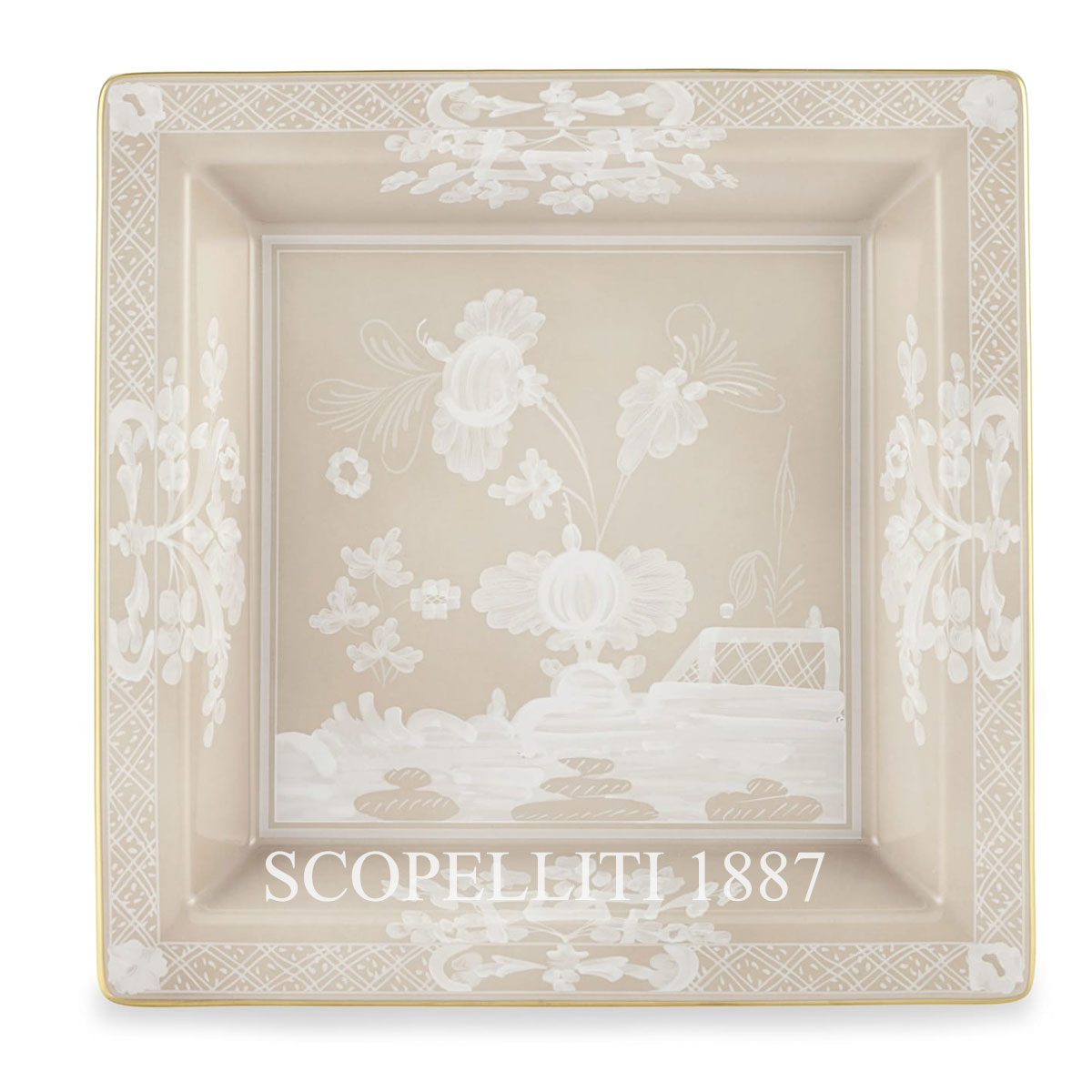 The Ginori 1735 Oriente Italiano Meringa Change Tray is an elegant porcelain piece, adorned with a soft Meringa beige hue and refined gold detailing. Its square shape, combined with its understated design, brings a sophisticated yet subtle presence to any space. As part of the Ginori 1735 Oriente Italiano collection, this versatile tray seamlessly complements both classic and modern interiors, blending timeless elegance with practical functionality. Place the Ginori 1735 Oriente Italiano Meringa Change Tray at your home’s entrance to greet guests with a touch of style, offering a tasteful spot to organize keys, coins, and other small essentials. On your desk, it serves as a refined organizer, adding order and elegance to your workspace. The tray is also perfect for serving finger foods, subtly elevating even the simplest table settings with a touch of luxury. For a striking centerpiece, pair the Ginori 1735 Oriente Italiano Meringa Change Tray with designer candles or porcelain vases from the same collection to create a focal point of timeless beauty. Presented in an exclusive luxury box, this elegant tray makes an exceptional gift for special occasions or a thoughtful surprise for loved ones, cherished for its seamless blend of artful design and practicality. Crafted with the artisanal expertise that defines the Florentine Ginori 1735 heritage, each piece from the Oriente Italiano collection is a work of art, bringing lasting beauty and sophistication to your home.