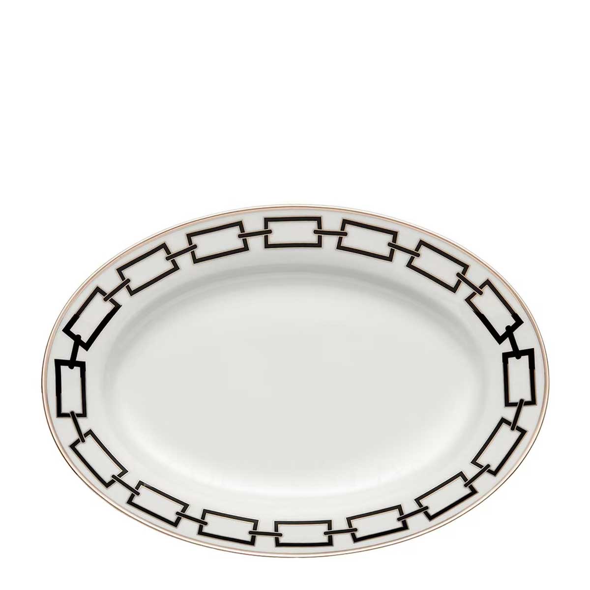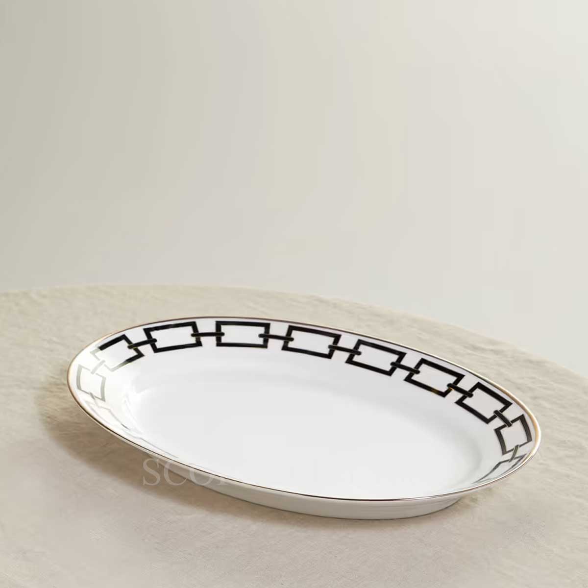 The ginori oval platter medium catene black showcases Gio Ponti’s sophisticated black chain motif, accented with refined platinum details. Crafted from luxurious white porcelain, this platter is perfect for elegantly presenting side dishes, starters, or desserts. Stylish and versatile, the ginori oval platter medium catene black comes in an elegant gift box, making it a distinguished addition to any fine dining experience.