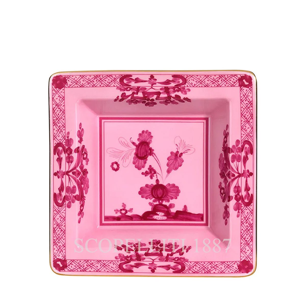 Part of the Oriente Italiano collection, this piece reflects a rich heritage of Eastern-inspired designs fused with Italian porcelain mastery. The Porpora pattern adds an exotic touch to any space, with its sophisticated floral patterns and rich colors. The Small Vide Poche is ideal for those seeking functional beauty in their home decor.