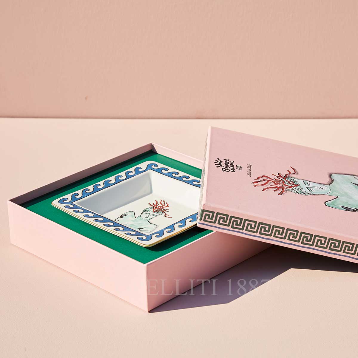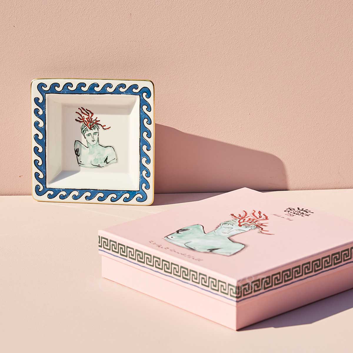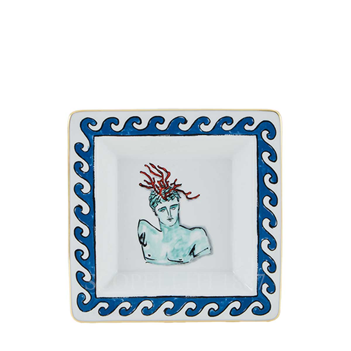 The Ginori Square Tray Small White il Viaggio di Nettuno brings timeless myth to life through the bold vision of designer Luke Edward Hall. At the heart of the tray lies the bust of Arion, son of Neptune, crowned with red coral—an iconic symbol of the sea. Surrounding the figure is a deep Grecian blue that evokes rolling waves, beautifully accented by pure gold threading, a signature of Ginori 1735’s artistic heritage. The Ginori Square Tray Small White il Viaggio di Nettuno is both a decorative statement and a functional piece, ideal as a change tray or refined accent on a console or vanity. Part of the kaleidoscopic Il Viaggio di Nettuno collection, this porcelain tray offers a poetic blend of Greco-Roman legend, Italian craftsmanship, and modern design sensibility.