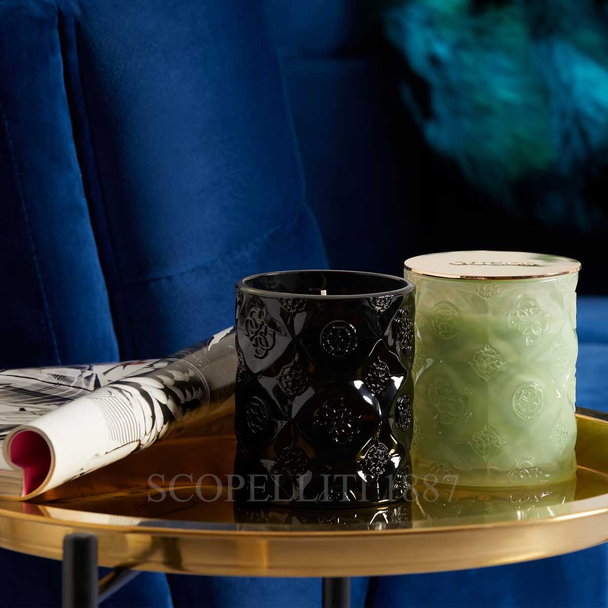 This elegant Guess Scented Candle Black with peony diamond cut is a glossy black glass jar with embossed patterns, that add a touch of sophistication to any space. The candle comes with a stylish gold-tone lid engraved with the “Guess” logo. It is packaged in a sleek black box with golden branding, making it ideal as a gift or a luxurious home accessory.