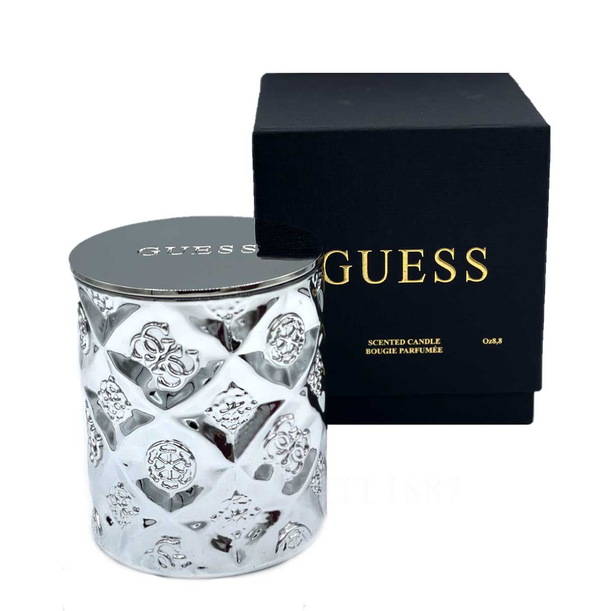 This elegant Guess Scented Candle Silver with peony diamond cut is a glossy silver glass jar with embossed patterns, that add a touch of sophistication to any space. The candle comes with a stylish gold-tone lid engraved with the “Guess” logo. It is packaged in a sleek black box with golden branding, making it ideal as a gift or a luxurious home accessory.