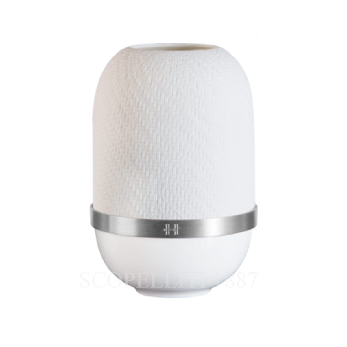 The Haviland Canevas Large Candle Holder Silver is a refined expression of Haviland porcelain made in Limoges, France. Crafted from luxurious bisque Limoges porcelain, this candle holder reveals a delicate relief pattern of hand-carved vertical lines, brought to life when illuminated by candlelight. Part of the Canevas collection, this large candle holder features a polished silver-finished metal ring engraved with the iconic “H” for Haviland.