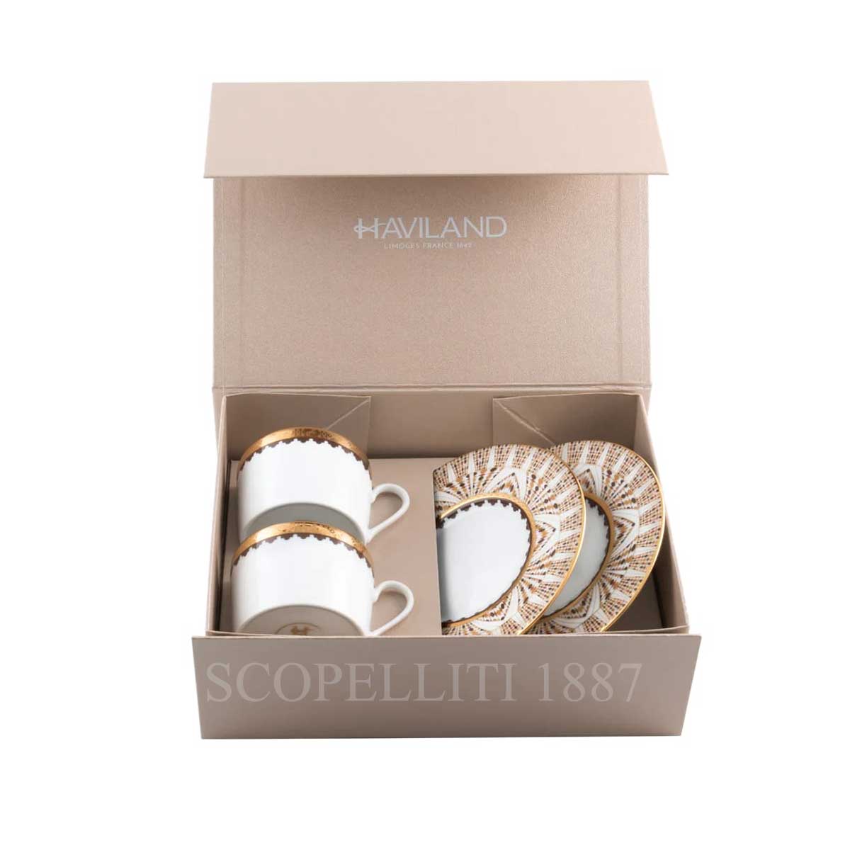 The Haviland Cavalier Royal Tea Cup and Saucer set is an elegant piece of fine Limoges porcelain. The cup features a white base with intricate gold detailing along the rim, including a repeating pattern inspired by Arabic mashrabiyya windows. The saucer showcases a symmetrical, geometric design in warm gold and brown hues, radiating outward in a star-like pattern. Inside the cup, a subtle silhouette of an Andalusian horse, framed within a quatrefoil shape, pays homage to the collection’s equestrian theme. This luxurious design combines traditional craftsmanship with rich cultural influences, making it a refined addition to any tea service. Experience the elegance of the Haviland Cavalier Royal Tea Cup and Saucer set and add a touch of equestrian-inspired beauty to your table setting.