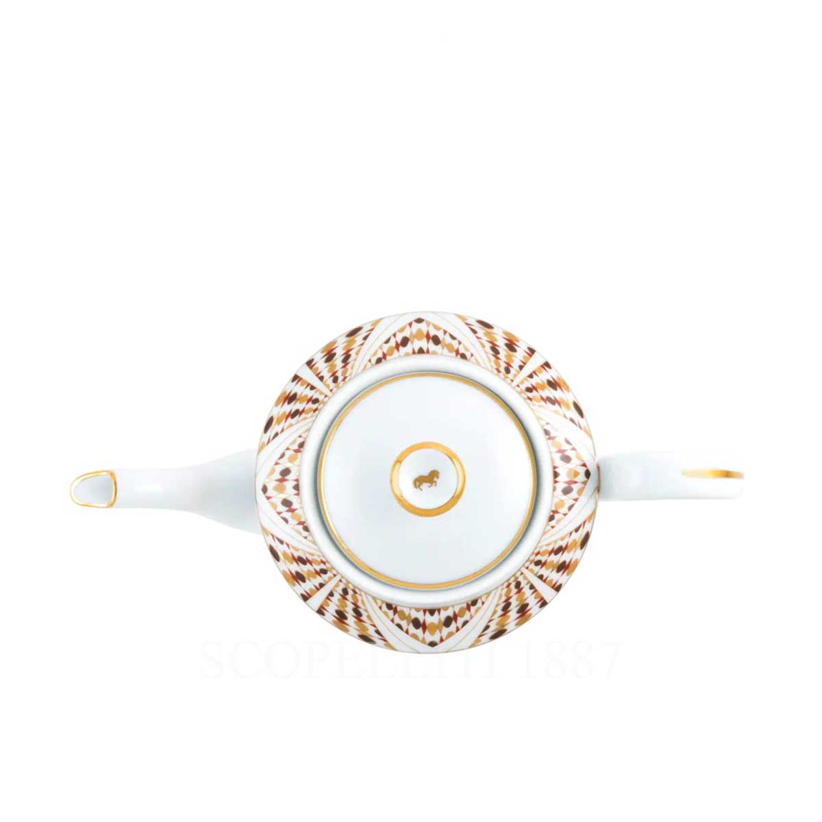 This elegant Haviland Cavalier Royal Teapot is crafted from fine white Limoges porcelain and features a raised relief of a horse within an ornate quatrefoil frame, adding a subtle and sophisticated touch. A decorative band along the rim of the lid and upper portion displays gold accents and geometric patterns in warm brown and red tones, reflecting Mediterranean and Moorish influences. The gracefully curved spout and elegant handle ensure functionality and beauty, while the gold-rimmed lid with a delicate golden knob enhances its luxurious appeal. Experience the elegance of the Haviland Cavalier Royal Teapot and add a touch of equestrian-inspired beauty to your table setting.