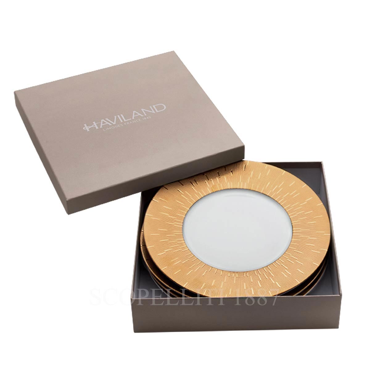 The Haviland Infini Prestige Set of 4 Dessert Plates Gold creates a refined and sophisticated dining experience. Expertly crafted from Limoges porcelain, each plate features a chic textured rim with intricate detailing and a luxurious golden hue, beautifully contrasting the smooth, crisp white center. A signature collection and one of Maison Haviland’s bestsellers, the Infini series embodies both modernity and timeless elegance with its counter-relief engraving, showcasing the exceptional craftsmanship of Limoges porcelain. Embrace the art of table setting with the Infini collection, where each plate is meticulously hand-painted in gold or platinum by skilled artisans. Available in a range of colors—white or gray for everyday elegance, and gold or platinum for special occasions—this collection combines tradition with contemporary flair. Handmade and decorated in France, it reflects Haviland’s commitment to excellence and artistry.