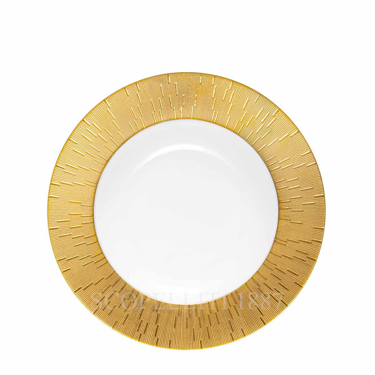 The Haviland Infini Prestige Gold Soup Plate is a stunning addition to any elegant dining experience. Perfect for pairing with complementing tableware, this luxurious plate enhances any setting, making it an ideal choice for both everyday meals and special occasions. Crafted from premium Limoges porcelain, the Haviland Infini Prestige gold soup plate features a sophisticated textured rim with intricate gold detailing that beautifully contrasts with the plate’s smooth, crisp white center. This timeless design reflects the perfect balance of modern style and classic craftsmanship, capturing the essence of Haviland’s legacy in Limoges porcelain. The counter-relief engraving adds an extra layer of refinement, showcasing the precision and artistry that has made the Infini collection one of Maison Haviland’s bestsellers. Handmade and decorated in France, each Haviland Infini Prestige gold soup plate is carefully painted in gold or platinum by skilled artisans, highlighting the finest traditions of porcelain craftsmanship. Available in a variety of colors—white or gray for everyday elegance, and gold or platinum for festive occasions—this collection seamlessly blends beauty and functionality. Care Instructions: Not suitable for microwave, oven, or dishwasher use