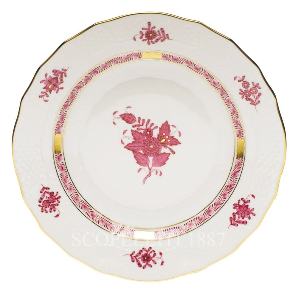 Herend hand painted Dessert Plate 01520-0-00 AP Apponyi Pink Form: Rocaille 1 pc – Ø 21 cm h 2,9 cm (8.25″D x 1.14″H) We are official distributor of Herend Porcelain, that is the world famous Porcelain Manufactory, operating for over 180 years. Herend is synonymous for unique, hand painted, master crafted porcelain. Apponyi, one Herend Porcelain Manufactory’s most renowned décors, was developed starting from the Fleur des Indes décor. In the centre of the plate it is possible to see a motif of a peony encompassed by leaves. A garland of stylized leaves runs all around the edge of the well and it is interrupted periodically by carved gilded rosettes. The ledge shows the contoured pattern of a flower surrounded by six leaves with a decoration of brilliant specks of gold.
